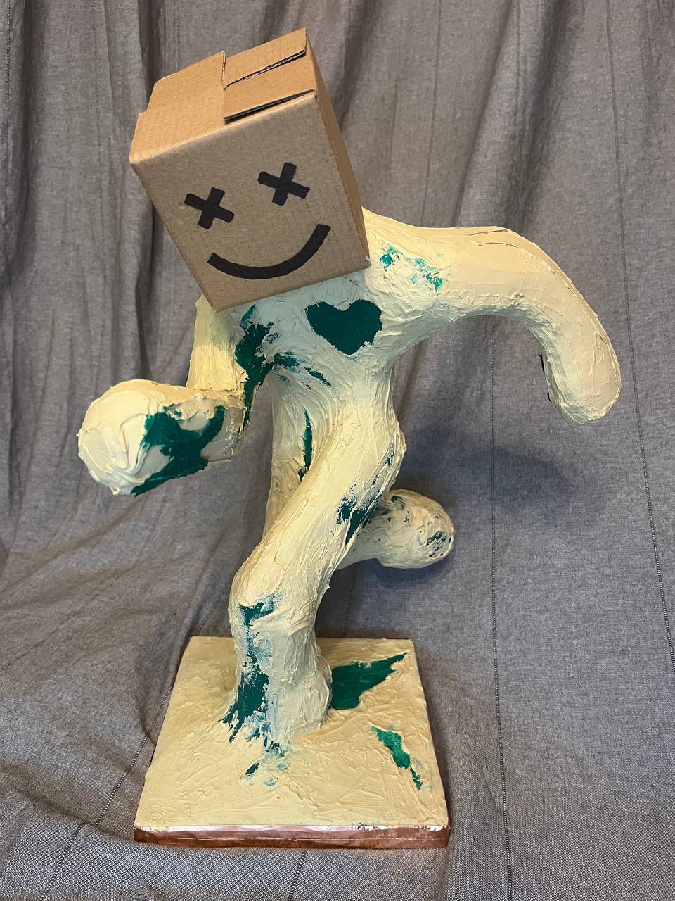 Скульптура «МИРОТВОРЕЦ» символизирует стремление к миру и нашу Родину в целом. Также, скульптура является моим автопортретом и передаёт внутреннее переживание и желание мира. Коробка на голове — это точная копия коробки, в которой я провёл перформанс на персональной выставке в прошлом году.