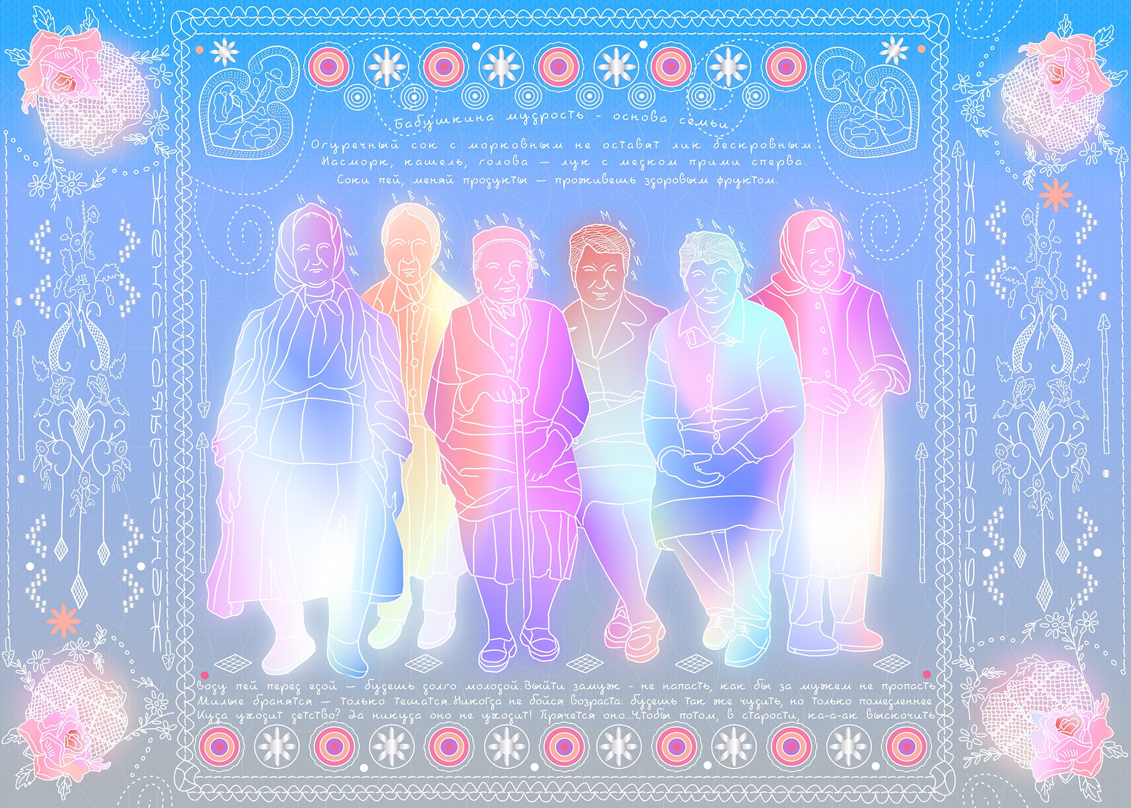 «Кладезь мудрості», работа создана в память о моих бабушках и прабабушках о сохранении и передачи ими традиционных ценностей и мудрости русского народа. Узоры и части элементов орнаментов отрисованы из тканных вещей обиходы крестьянского дома, чудом сохранившихся до нашего времени.