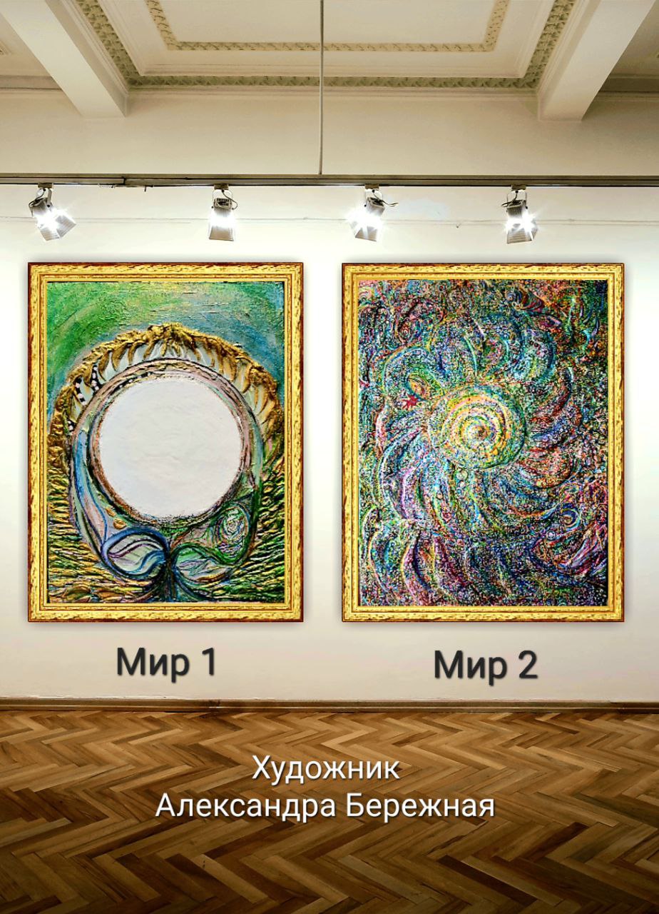 На картине Мир 1 изображено состояние до развития каких либо эмоций в полном спокойствии. В картине Мир 2 мы создаём зародыш любви жизни, силы мирного процветания и развития жизни в счастливом настоящем, тем самым, признавая победу жизни.