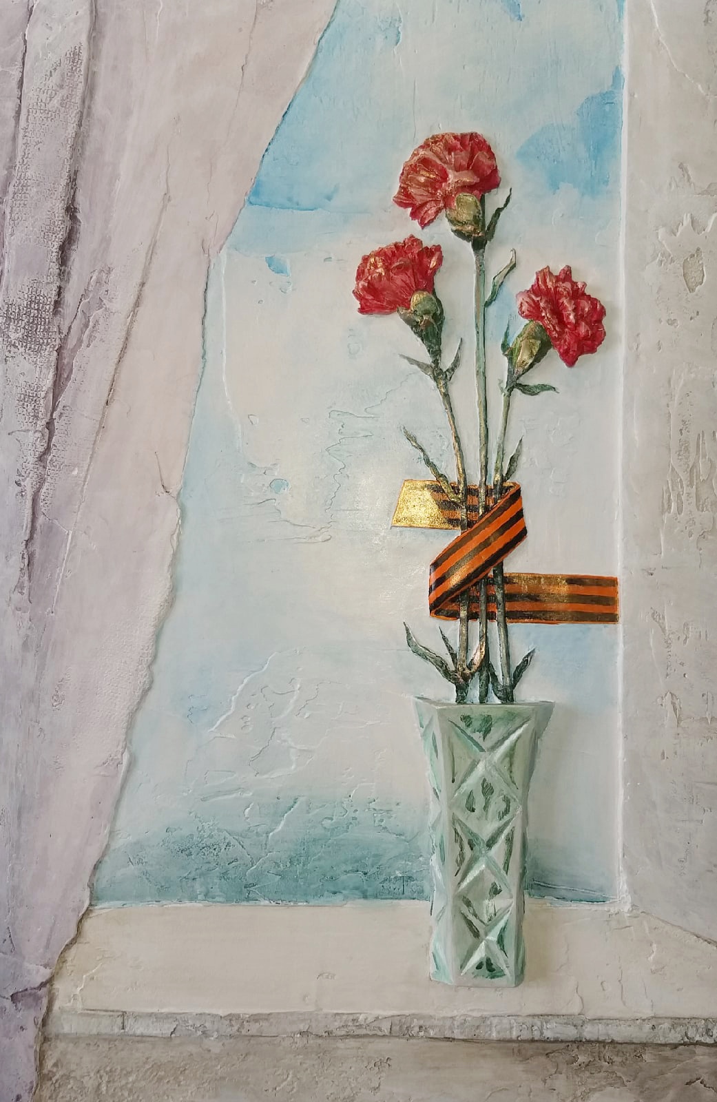 Барельеф «Цветы ветерана» был создан мной еще в 2020году на конкус посвященный 75летию Победы. Тогда я еще и не знала на сколько будет символична лента в форме буквы Z. Мне всегда становилось грустно от мысли, что ветераны, которых поздравляли 9мая, придя домой, после шумных поздравлений, оставались в тишине и одиночестве. Не раз ветеран взглянув в окно на небо сквозь гвоздики сидел и вспоминал товарищей, сражения, свои надежды и веру на Победу. И лента в картине, как бы символ их связи с внешним миром, ведь о них чаще вспоминают в День Победы.