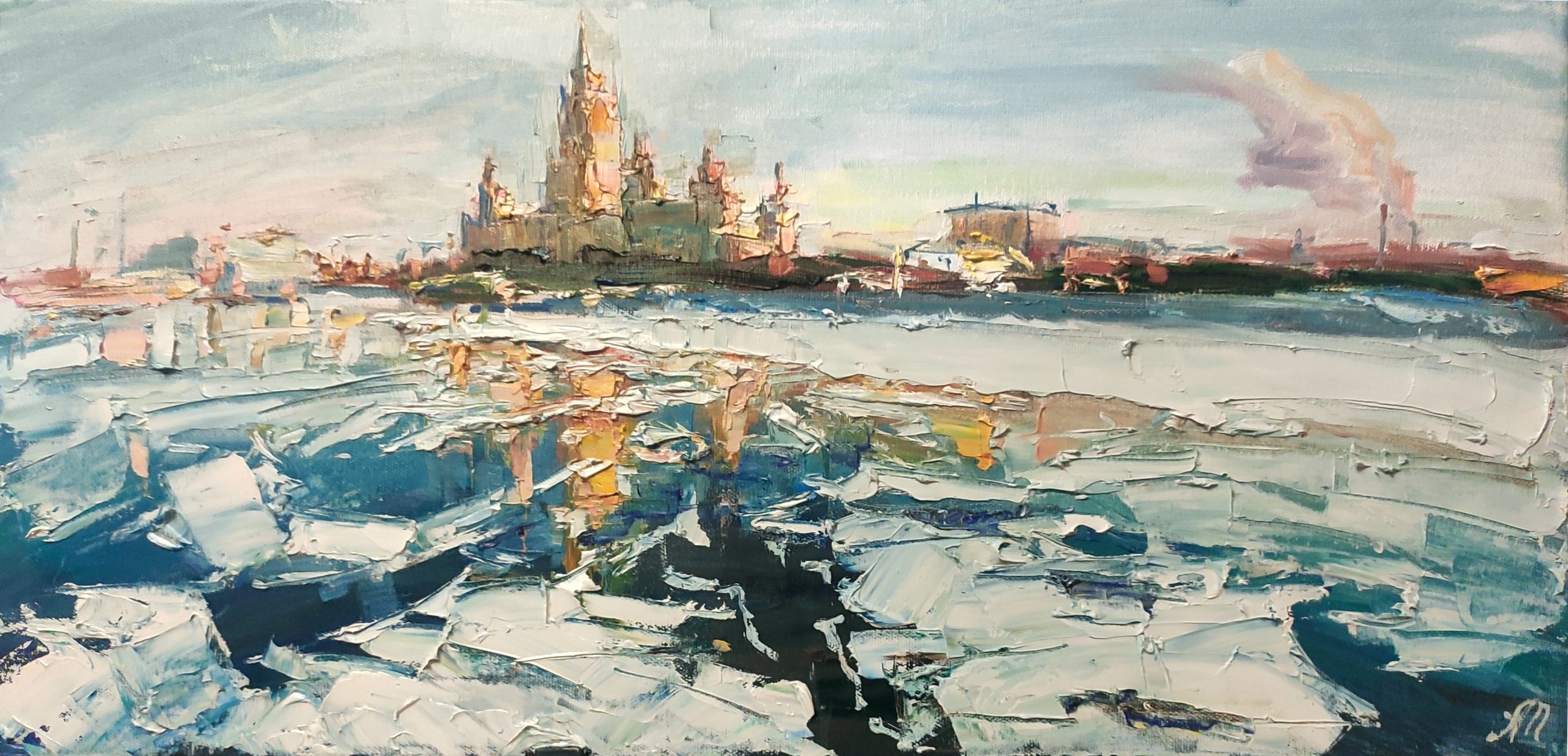 Вид через тающий лед Москвы-реки на силуэт гостиницы «Украины». В этом хрупком пейзаже ранней весны, где сквозь подтаявшие льдины проглядывает глубокая синева речного дна, видится аллегория надежды – желание, чтобы лед отчуждения, сковавший отношения с Украиной, навсегда растаял, уступив место теплу и свету