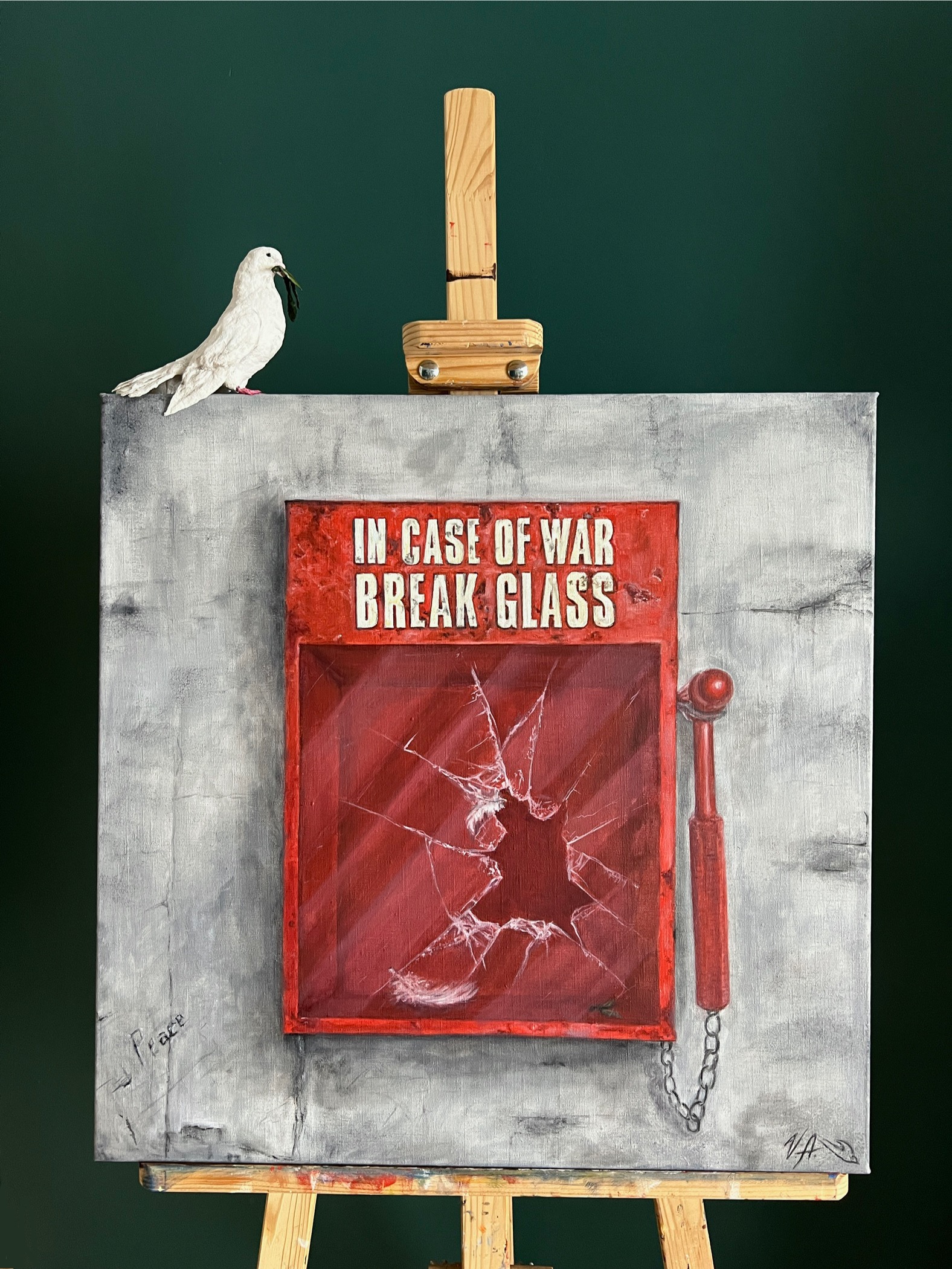 Эта работа — современное переосмысление метафоры «голубя мира», помещённого внутрь аварийного короба с надписью: «In case of war — break glass» («В случае войны — разбей стекло»). Картина подчёркивает парадоксальное восприятие мира как крайней меры, к которой прибегают только в случае катастрофы. Центральным образом является голубь с оливковой ветвью — традиционный символ мира, надежды и диалога. В дополнение к живописной части, над коробом размещена авторская ватная игрушка, выполненная вручную. Этот голубь словно «вырвался» из разбитого стекла картины — образ, который подчеркивает живую, актуальную потребность в мире, который должен выйти за рамки символа и стать реальностью. Работа говорит о хрупкости мира и нашей коллективной ответственности не «разбивать стекло» в последний момент, а стремиться к постоянному миротворчеству, сотрудничеству между народами и сохранению общечеловеческих ценностей. Изначально автор планировал создать серию разных голубей-персонажей, каждый из которых по-своему менял бы настроение и даже смысл картины. Но к моменту окончания приёма заявок успел сделать только одного.