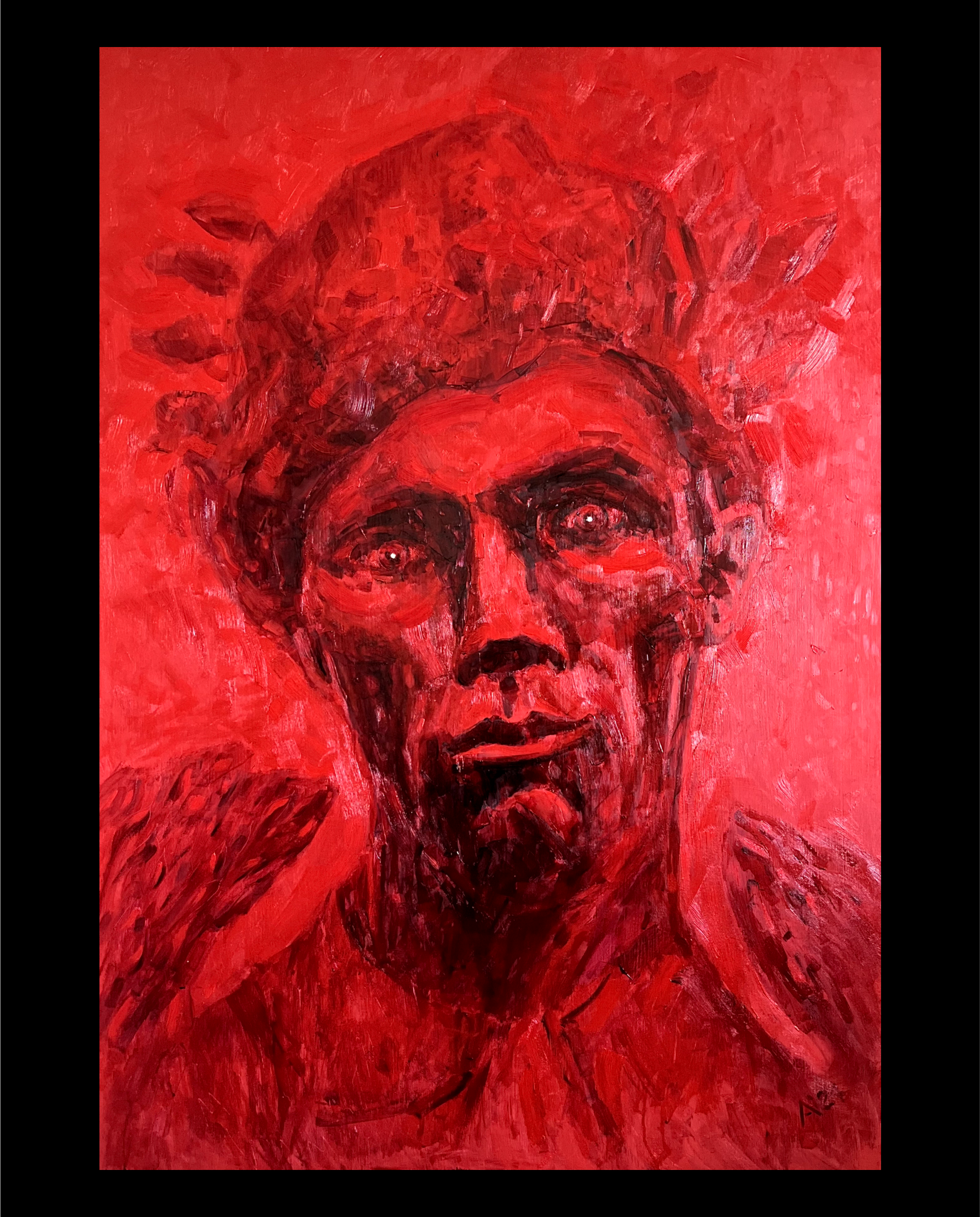 «Слова, они часто искажают суть, образы порой не оковать и не обрамить ими, я прибегаю к пластическому языку. Работа сделана на основе документального фото советского солдата, для себя зову его Алеша. Алеша это взгляд в бесконечность, это громкие и тихие слова о главном, которые не сказаны но все их слышат»