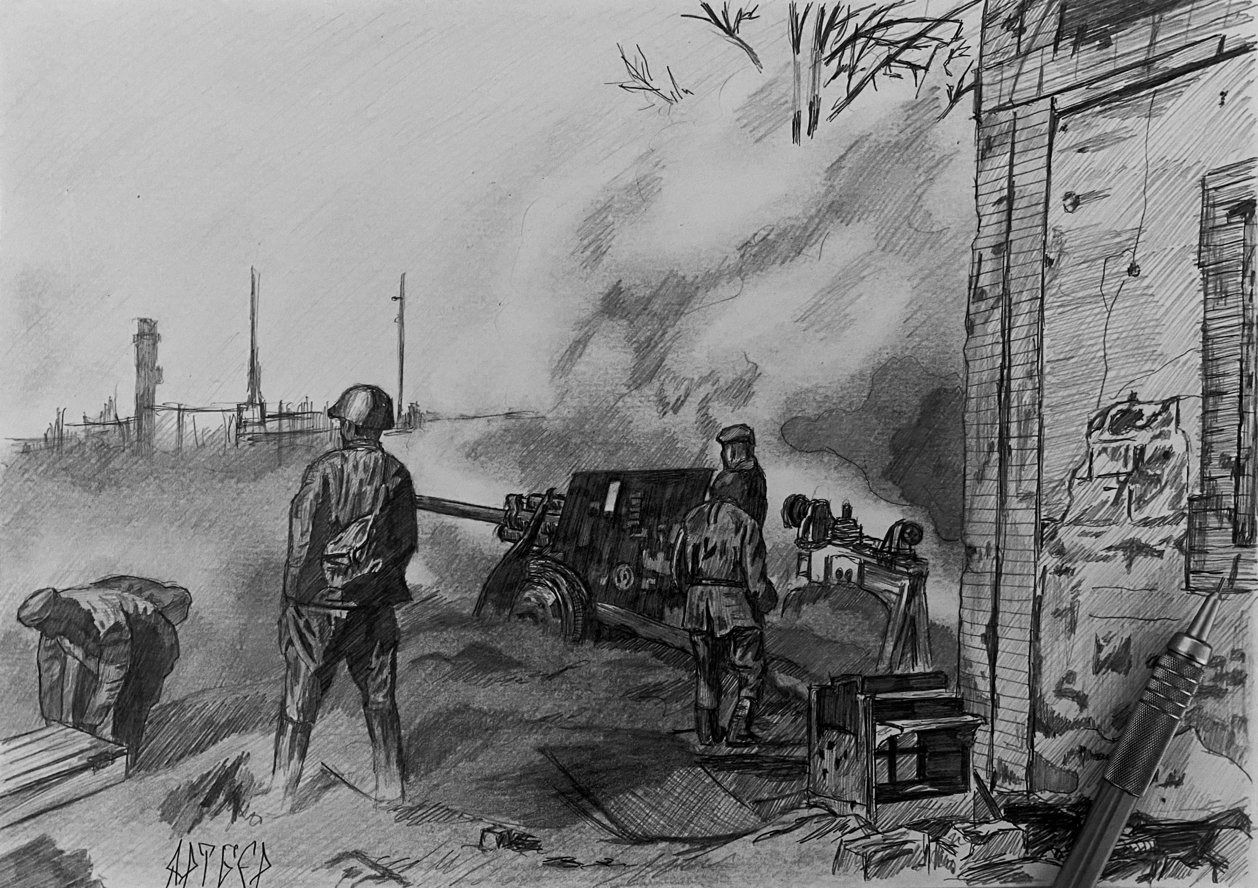 Расчет 76-мм дивизионной пушки ЗИС-3 прямой наводкой ведет огонь по немецким танкам, прорвавшимся на улицы Сталинграда. Сентябрь 1942 года