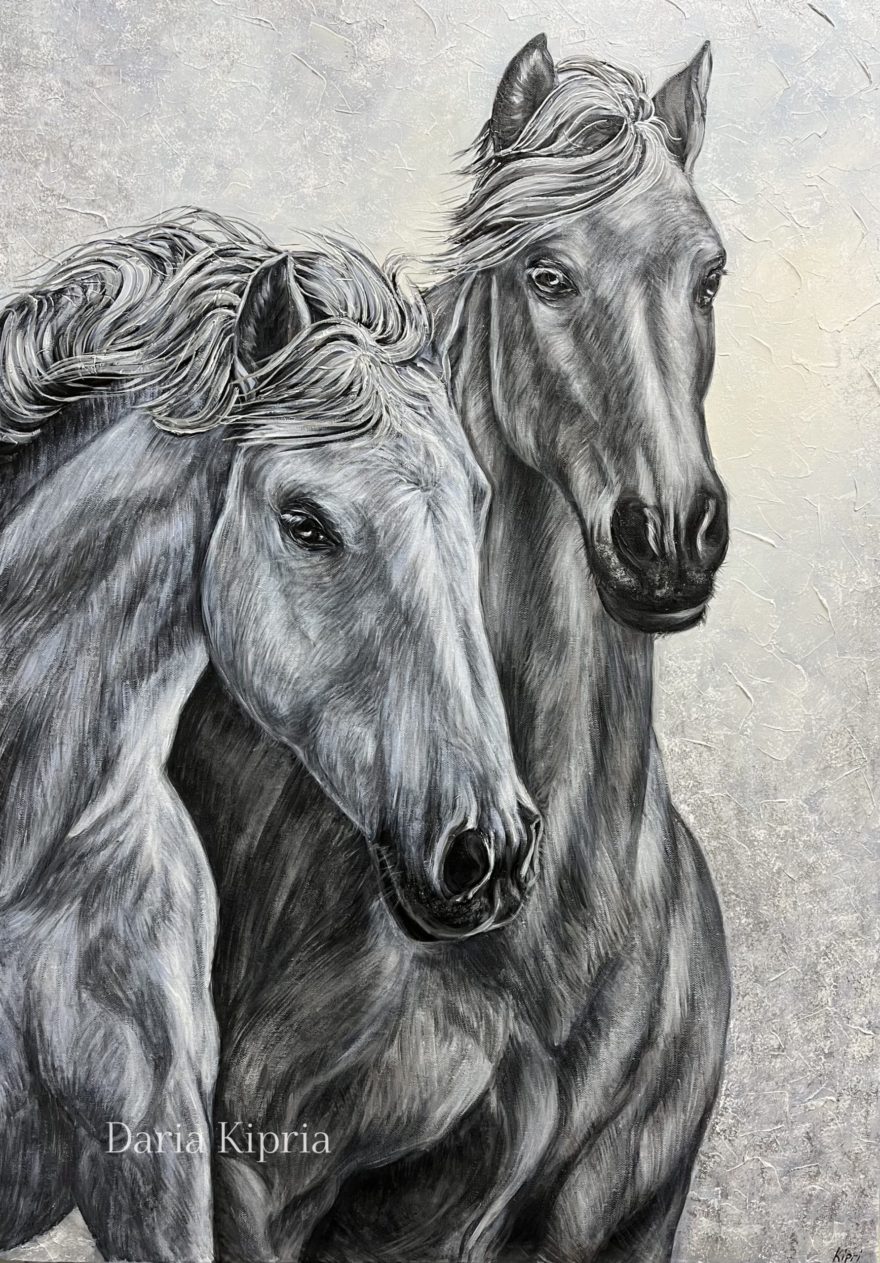 «Сила в единстве» Два коня, будто два сердца, бьющихся в унисон. Их образы — символ любви, ставшей опорой друг другу. Не просто союз — это единение душ, в котором рождается настоящая сила. Их стойкость — не от упрямства, а от верности. Их спокойствие — не от безразличия, а от глубокой любви. Они не бегут — они стоят вместе, плечом к плечу, зная: любовь не требует слов, когда она настоящая. Так и мы: только в любви, где есть поддержка и доверие, мы обретаем ту силу, что помогает пройти любой путь.