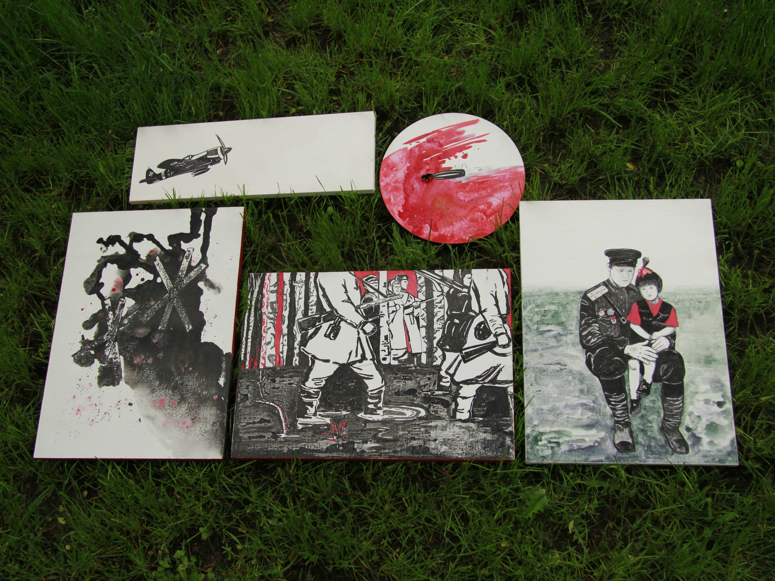 Серия работ, представленная на конкурс в номинации «Хроники Великой Победы», посвящена памяти моего дедушки, Глухова Александра Васильевича, участника Великой Отечественной войны. Самолет, словно призрак прошлого, нависает над зрителем, вызывая чувство тревоги. Он мог быть разведчиком и лететь, в моменте не представляя угрозы, красивая, современная по тем временам, летательная машина. Белый фон, вокруг него, пустое информационное поле, его цель найти эту информацию, ведь он разведчик. А мог стать бомбардировщиком, и мы видим взрывы на соседнем полотне. Противотанковые ежи и взрывы, разрушительная сила войны, жертвы, которые пришлось пережить моему дедушке и его товарищам. Взрывы, словно вспышки боли, разрывают тишину, оставляя после себя пепел и воспоминания. Партизаны — оммаж к иллюстрации из книги С. Симакова «В лесу прифронтовом», в которой рассказывается о подвигах партизанского отряда «В бой за Родину!» им. Н. Бусловского, с ними воевал мой дедушка. В одной из глав рассказывается и о его подвигах, за которые он был награжден орденами Отечественной войны 1 степени и Богдана Хмельницкого, медалью «За отвагу» и медалью партизана ВОВ. Выстрел в красном круге — раненый холст и время остановилось в моменте, когда мир был на грани разрушения. Портрет дедушки с младшей дочерью символизирует мирное будущее, ради которого он и другие люди сражались. Эти работы выполнены в авторской технике Галлитика с использованием акрила, туши и соли. Соль, как символ мудрости, напоминает о том, что память о подвиге предков должна быть сохранена и передана будущим поколениям. Идея представления этой серии работ на земле и траве в Москве, подчеркивает значимость подвига моего дедушки. Он участвовал в битве за Москву и вместе с другими героями защитили наш город. Его нет в живых, но есть наша связь, через эту землю и моя благодарность.