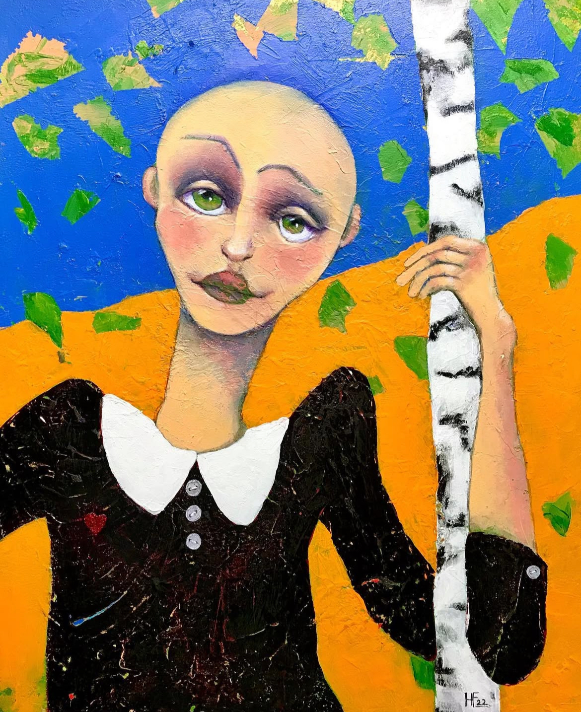 «Босиком среди берез» Березы для меня символ России. Этой работой я хочу сказать, что как бы тяжело не было, какие бы катастрофы и войны не происходили, нужно искать силы в Природе, Родине, родном месте где ты живешь. Девочка как символ уставшей от войн страны, искалеченная потерями людей, но твердо стоящая на ногах под голубым небом. Платье девочки — отсылка к советской школьной форме, потому что поднимаясь с колен, мы заново создаем мир, где дети ходят в школы, на полях золотится рожь, а в стройных белоснежных стволах течет березовый сок. Некая метафора нового мира и несгибаемой воли российского народа.