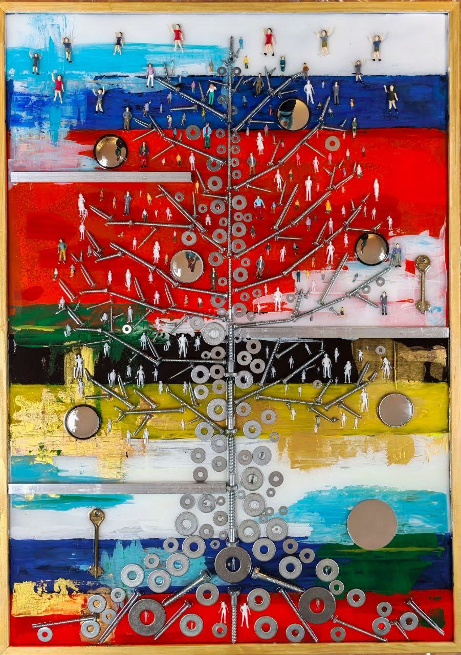 Работа, выполненная с использованием символики цветов и геометрических форм, представляет историю Российской государственности, её культурного наследия и связь между поколениями. Главным элементом композиции является дерево жизни, которое олицетворяет преемственность поколений, развитие общества и единство народа. Металлические детали дерева акцентируют внимание на прочности основ государства и техническом, культурном прогрессе. Фон картины состоит из разноцветных прямоугольников, каждый из которых отражает цвета, применявшиеся в Российской геральдике и на государственных флагах в разные исторические эпохи. Металлические молдинги определяют исторические эпохи в которых использовались те или иные цвета в Российской геральдике. • Красный — символ мужества, силы и борьбы за независимость. Этот цвет присутствовал на многих знаменах Древней Руси, потом СССР и в современной России. • Синий — символ верности, честности и постоянства. • Белый — олицетворяет чистоту, мир и духовность. Белый цвет стал важной частью российского триколора, впервые использованного при Петре I. • Чёрный — символ власти и стабильности. Чёрный цвет был частью гербового флага Российской империи. • Жёлтый и золотой цвета в флагах России символизировали могущество и богатство, щедрость и величие. • Зелёный — ассоциируется с природой, жизнью и развитием. Зелёный цвет можно встретить на Стягах при Иване Грозном, военных знаменах и символах Российской империи. • Голубой цвет в флагах Российской империи символизировал верность, честность и постоянство. Голубой цвет отражал идеалы и ценности, связанные с теми, кто служил и защищал Родину. Миниатюрные фигурки людей, расположенные на дереве, представляют поколения граждан России и их вклад в развитие страны и её историю. Это подчеркивает, что государство строится усилиями каждого человека. Работа служит историческим напоминанием о многовековом пути России, её символах и ценностях.