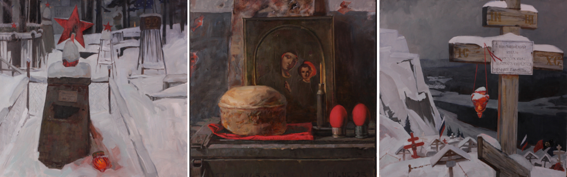 Саржанов Р.Ж. Нетреба Е.С. Аще кто положит душу свою за други своя (Ин 15:13) холст масло 2025 «Нет больше той любви, аще кто положит душу свою за други своя» Евангелия от Иоанна (Ин. 15:13). Через эту заповедь мы осознаем, что самопожертвование — это наивысшая добродетель и видим почитание подвига, Богом установленного, к которому призван любой сознательный гражданин общества, страны, народа. Этот долг Святым называется Оттого, что только Святою Любовью В этом мире все созидается! Оттого, что Заповедь эту Сам Господь на сердцах написал: Нет любви святее и больше, Да кто жизнь свою за други отдал. Только те этот долг до конца исполняли, Кто за Родину-Мать свои жизни отдали. Кто в любую минуту, и в стужу, и в зной Был за правое дело готов идти в смертный бой, Жизнь отдать, кровь пролить, Чтоб потомки чрез это продолжили жить. За плечами страна, впереди цель одна — Защитить ту, которая нам от Бога дана — Беззащитная жизнь миллионов детей, Слезы хрупких, но верных в любви матерей, Сохранить свою веру, отцовскую землю и честь дочерей, Свой великий, могучий язык и святыню церквей. Так почтим же минутой молчания тех, О которых достойно сказать нам не хватит и слов всех Первый холст: ПАСХА Композиция построена вокруг пасхального стола, где каждый предмет несет глубокий символический смысл. В центре – старинная икона. Рядом расположен каравай хлеба, символизирующий тело Христово и жертвенность. Особое внимание привлекает гильзы, использованные как подсвечник, а также выступают в роли подставки для пасхальных яиц, создавая контраст между военной атрибутикой и пасхальной символикой. Военный оружейный ящик служит постаментом для всей композиции, напоминая о Великой Отечественной войне и Пасхе 1945 года, а также о бойцах сегодня, защищающих нашу Родину. Этот холст – метафора соединения христианской жертвенности Христа и подвига наших солдат, отдавших и вновь отдающих жизни за спасение человечества от фашизма. Второй холст: ТИШИНА Центральный элемент – старая могила солдата Великой Отечественной войны. Постаревший памятник с пятиконечной звездой укрыт белым потном снега и только отсветы лампады оставленной около него символизируют неугасимость памяти и свет правды о тех скорбных и великих днях. На заднем плане, сквозь сосны возвышается православный храм, намеком дан современный городской пейзаж, представленный высотными домами с освещенными окнами. Все это символизирует связь времен и поколений, когда память о героях живет в сердцах современников. Свет в окнах домов создает ощущение непрерывности жизни и преемственности памяти. Третий холст: ПОКОЙ Пейзажная часть триптиха представляет собой величественный вид с горы на уральский простор. На переднем плане – могила бойца, расположенная на возвышенности, откуда открывается панорама родных просторов. Главный акцент – неугасимая лампада, горящая на кресте, установленном на вершине. Пламя лампады, словно путеводная звезда, освещает путь и символизирует вечную память о павших защитниках. Бескрайние просторы Урала подчеркивают масштаб подвига и значимость жертвы солдат. Цветовая гамма триптиха построена на контрасте теплых и холодных тонов, где свет свечей и лампады создает ощущение духовного света, пронизывающего все три части композиции. Работа объединяет религиозную и военную символику, под