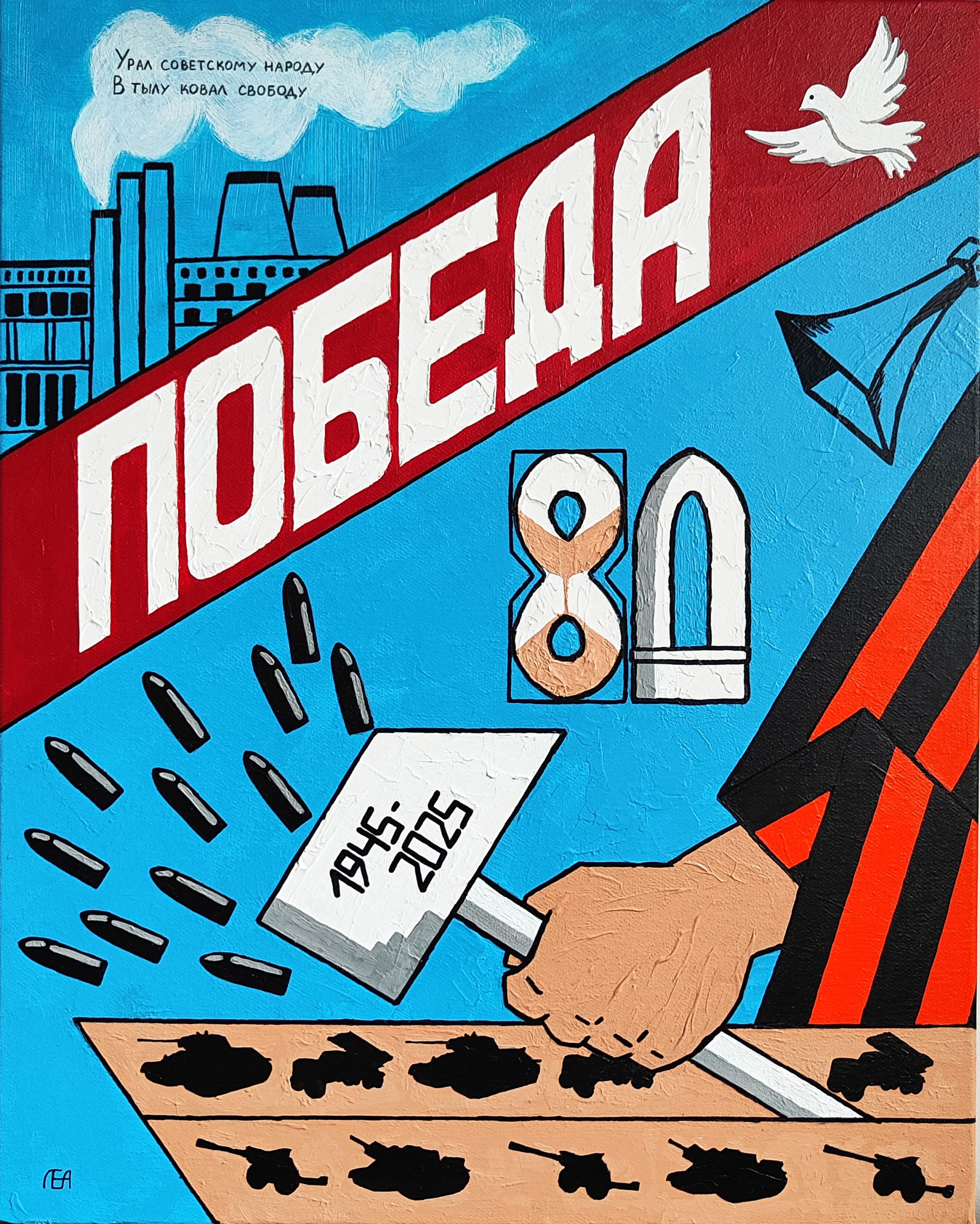 Эта картина посвящена 80-летию Победы и вкладу Урала, который стал надёжным тылом стране. На Урал было эвакуировано более 800 заводов. Крепкая рука держит молот, из-под которого вылетает огромное количество снарядов. Урал давал стране 40% всей военной продукции. Производили бронетехнику, танки Т-34, «Катюши», самоходные артиллерийские установки, гаубицы и огромное количество боеприпасов. 80 лет Победе! Цифра 8 изображена в виде песочных часов, они символизируют, что время идёт, но мы помним. Цифра ноль стилизована в виде снаряда, обозначая мощный вклад в Победу. Рупор символизирует интересный факт: в годы ВОВ самый знаменитый диктор Юрий Левитан жил и работал в Свердловске в условиях строжайшей секретности. Конечно, многие жители об этом знали и хранили тайну. С Днём Победы и мирного неба!