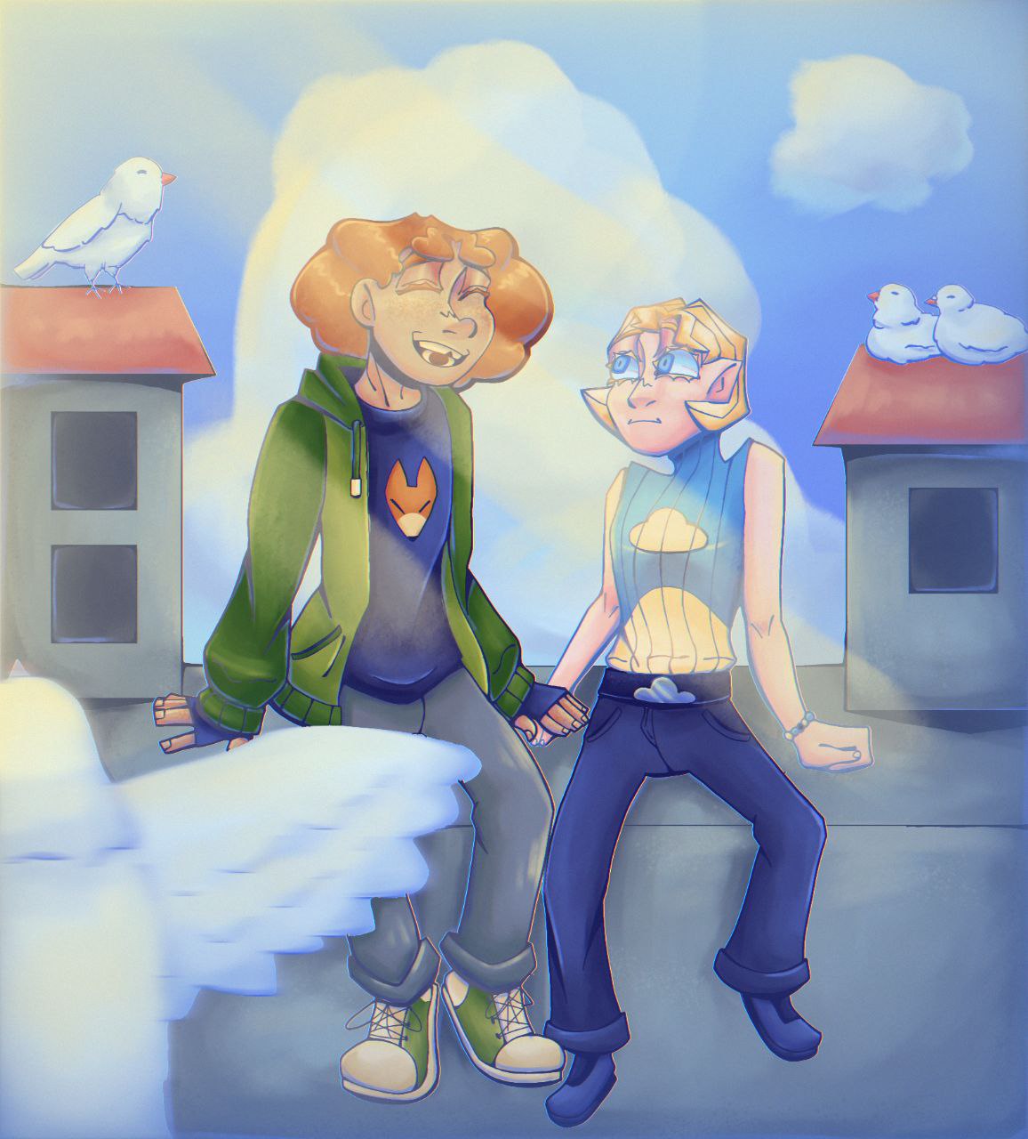 Картина безмятежного детства , не обремененного тревогами . Ребята сидят на крыше и смеются, в моем видении так бы ощущался мир без войн