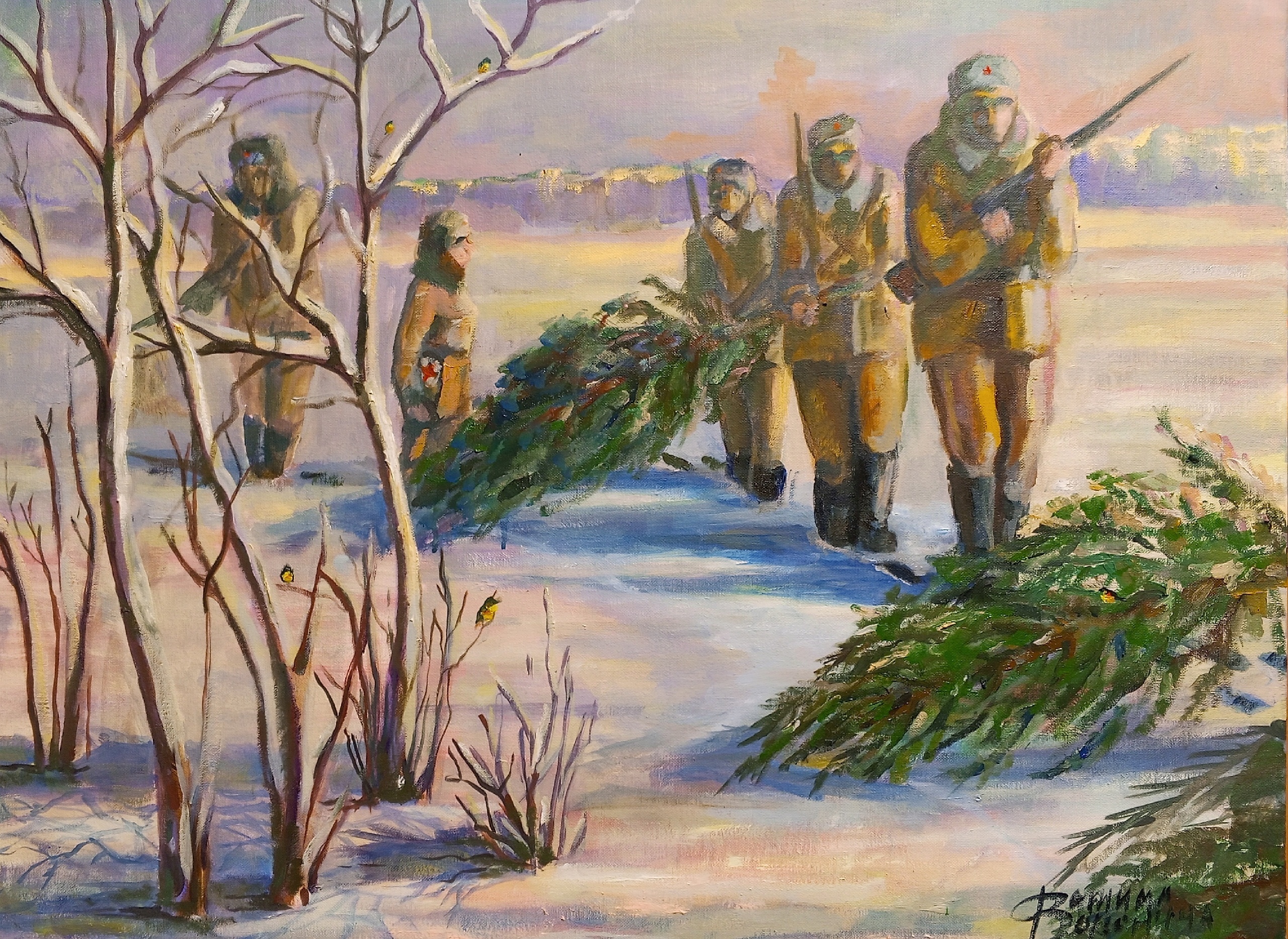 Елки к Новому году. Выполнено. Холст, масло, 60/80. Осажденный Севастополь, канун 1942 года. Секретарь севастопольского горкома комсомола А. Багрий поставил начальство перед необходимостью организации для севастопольских детей, живущих в подземельях, праздника с елками (соснами), исполняющим его и поставили. Однако, на незанятых врагом территориях сосен не было и Александр со своими друзьями и помощниками обратились за помощью к полковнику Горпищенко. Всю историю можно найти на просторах. Сосны росли на захваченных территориях и полковник отправил туда пятерых разведчиков, двух пулеметчиков и девушку-медика. Группа вернулась вся. С соснами и двумя пленными. Выполняя задание полковника, они вступили в бой и ушли победителями и выполнив задачу. Вот такая невероятная и прекрасная история о героях Севастополя. Я изобразила их возвращение с задания.
