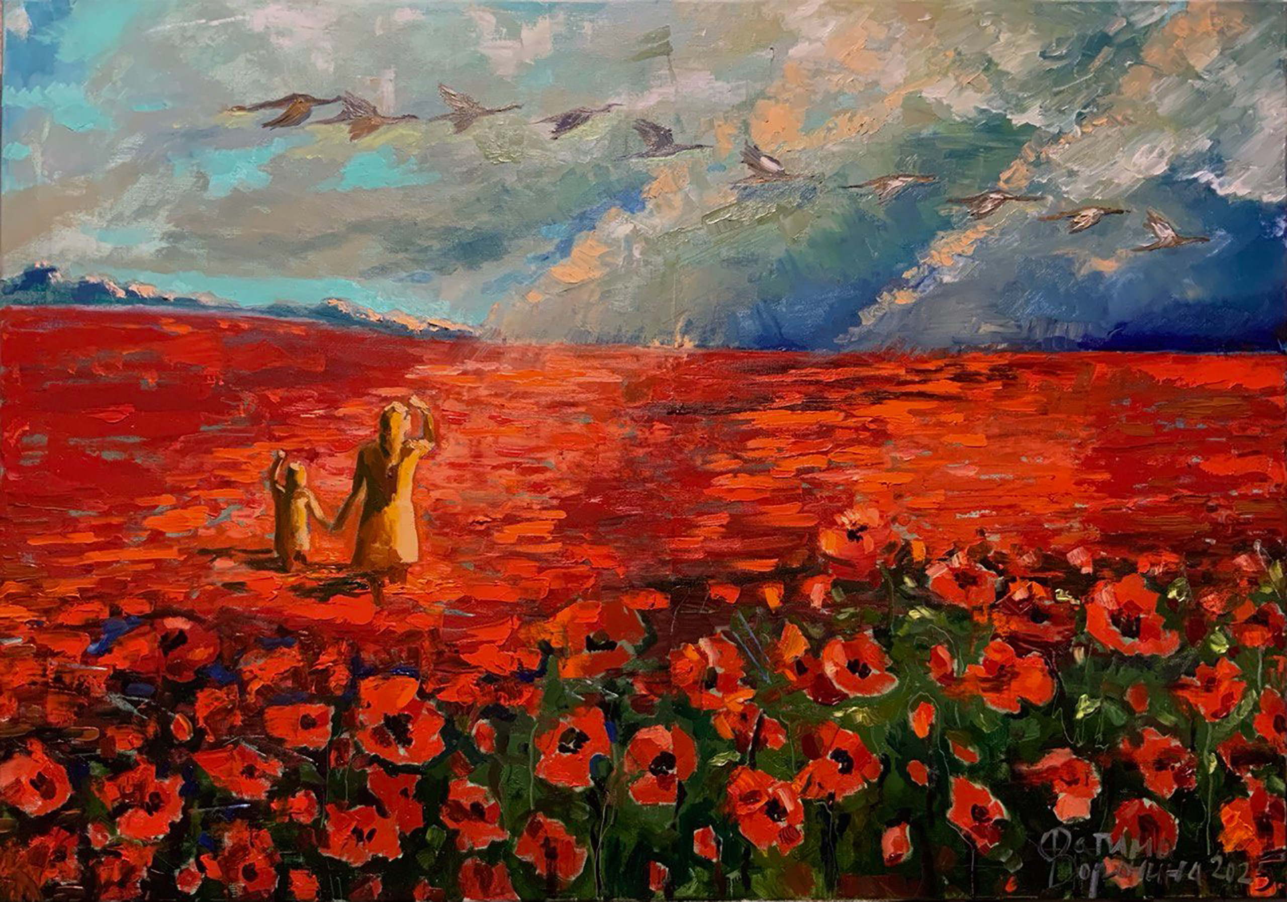 Журавли. Холст, масло,70/100. Журавли. Марк Бернес Слова Расула Гамзатова. Мне кажется порою, что солдаты, С кровавых не пришедшие полей, Не в землю нашу полегли когда-то, А превратились в белых журавлей. Они до сей поры с времён тех дальних Летят и подают нам голоса, Не потому ль так часто и печально Мы замолкаем, глядя в небеса. Летит, летит по небу клин усталый, Летит в тумане на исходе дня, И в том строю есть промежуток малый, Быть может, это место для меня. Настанет день и с журавлиной стаей Я поплыву в такой же сизой мгле Из-под небес по-птичьи окликая Всех вас, кого оставил на земле. Мне кажется порою, что солдаты, С кровавых не пришедшие полей, Не в землю нашу полегли когда-то, А превратились в белых журавлей. Они до сей поры с времён тех дальних Летят и подают нам голоса, Не потому ль так часто и печально Мы замолкаем глядя в небеса. Что тут говорить. С детства я знаю песню «Журавли», с детства слышала, что маковые поля расцветают в память о пролитой крови. Наступает весна, мы радуемся цветам, но для меня, кроме радости и красоты они несут и память.
