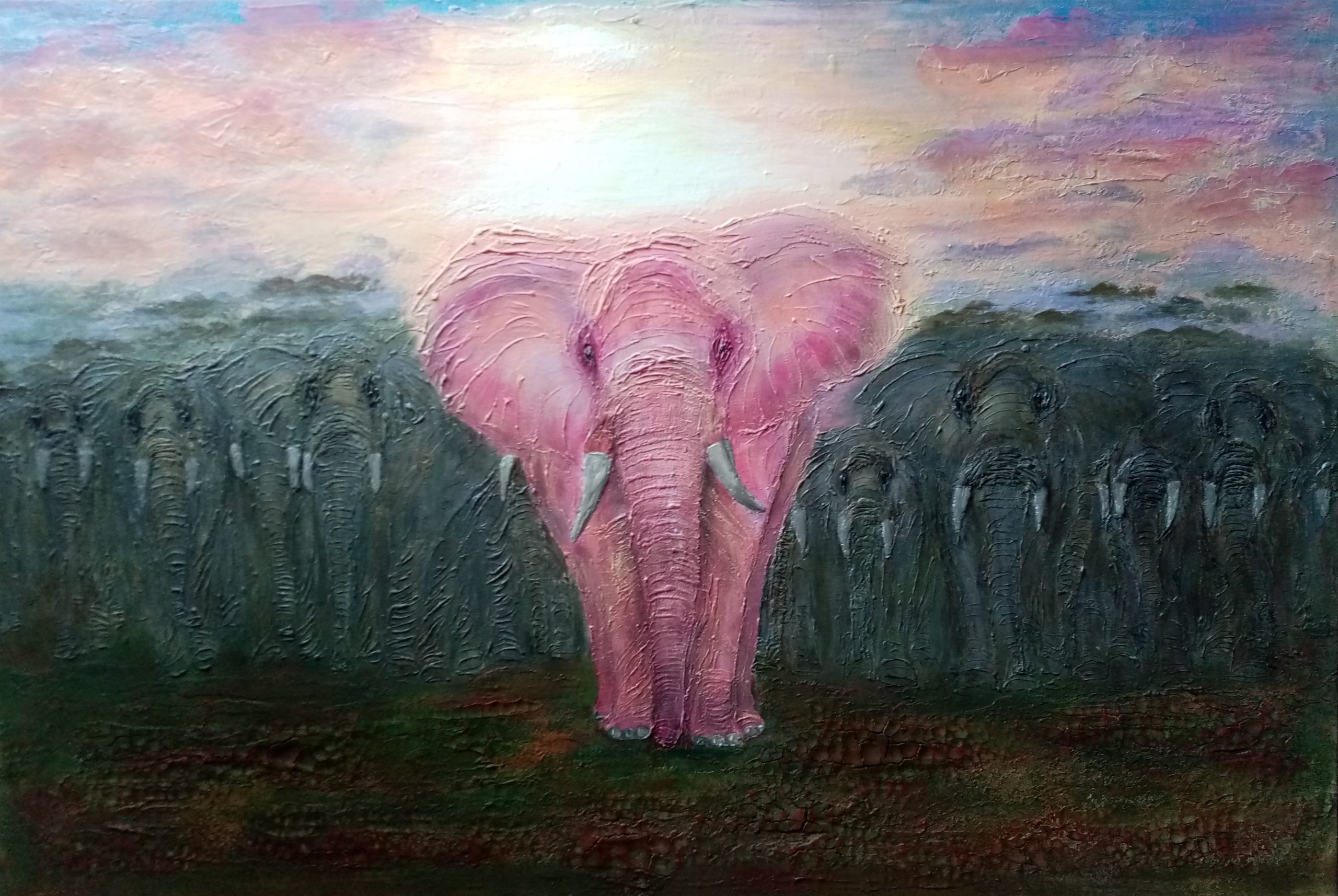 Он идет. Розовый слон Однажды я прочитала, что если во время войны в поселение приходит розовый слон, то скоро война закончится. Он идет. И за ним наше воинство стеной. Они встают из земли и уходят в небо. Или сходят с небес и врастают в землю. Белова Г. «Он идет. Розовый слон».