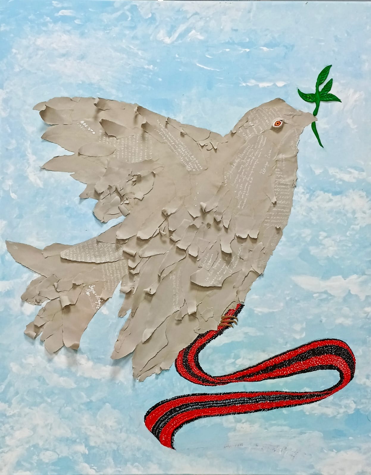 «Голубь мира» групповая работа команды Арт-веранда.дети Мы переосмыслили голубя мира Пикассо. Его перья это письма бойцов родным.а в лапках голубь зажимает георгиевскую ленту — символ Победы 1945 года в Великой Отечественной Войне. Ленточку мы буквально шили из краски, каждую строчку. Как символ того, что победа соткана усилиями многих — и по ту и по эту сторону баррикад. Эта Победа бесценна. Мир переданный нам предками это очень большое наследие. Большая ответственность. Письма записанные на перьях — с настоящих писем солдат. И неслучайно голубь. Еще Пикассо отметил, что голубь совсем не мирная птица. Она умеет отстаивать свою территорию. И всегда возвращается в родные пенаты. Так что не только библейская благая весть, но и родной, раз вернулся, свой. В создании инсталяции участвовали: Руководитель: Шашкина Юлия Владимировна Моденко Ярослав Брагинская Александра Агавелова Жанна Батоева Валерия Пестин Дмитрий Иванова Ева Ларичева Элеонора Савченко Анастасия