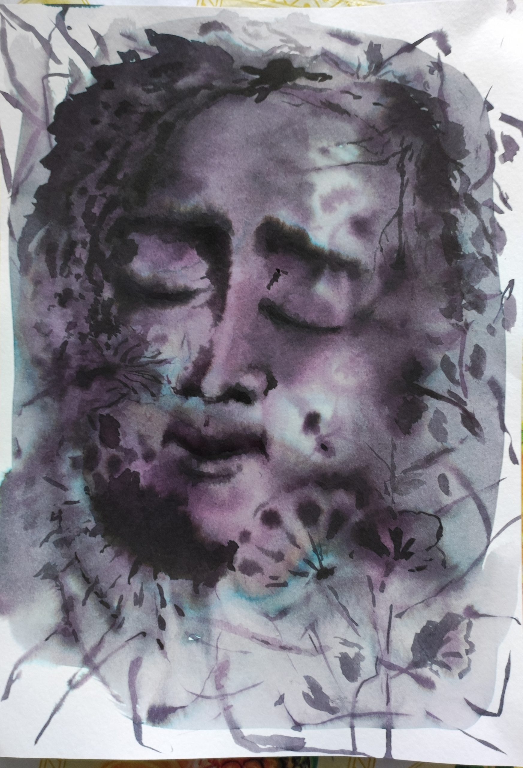 На картине изображено лицо мужчины, который чувствует боль утраты . Закрыв глаза он мужественно переживает эти мгновения.