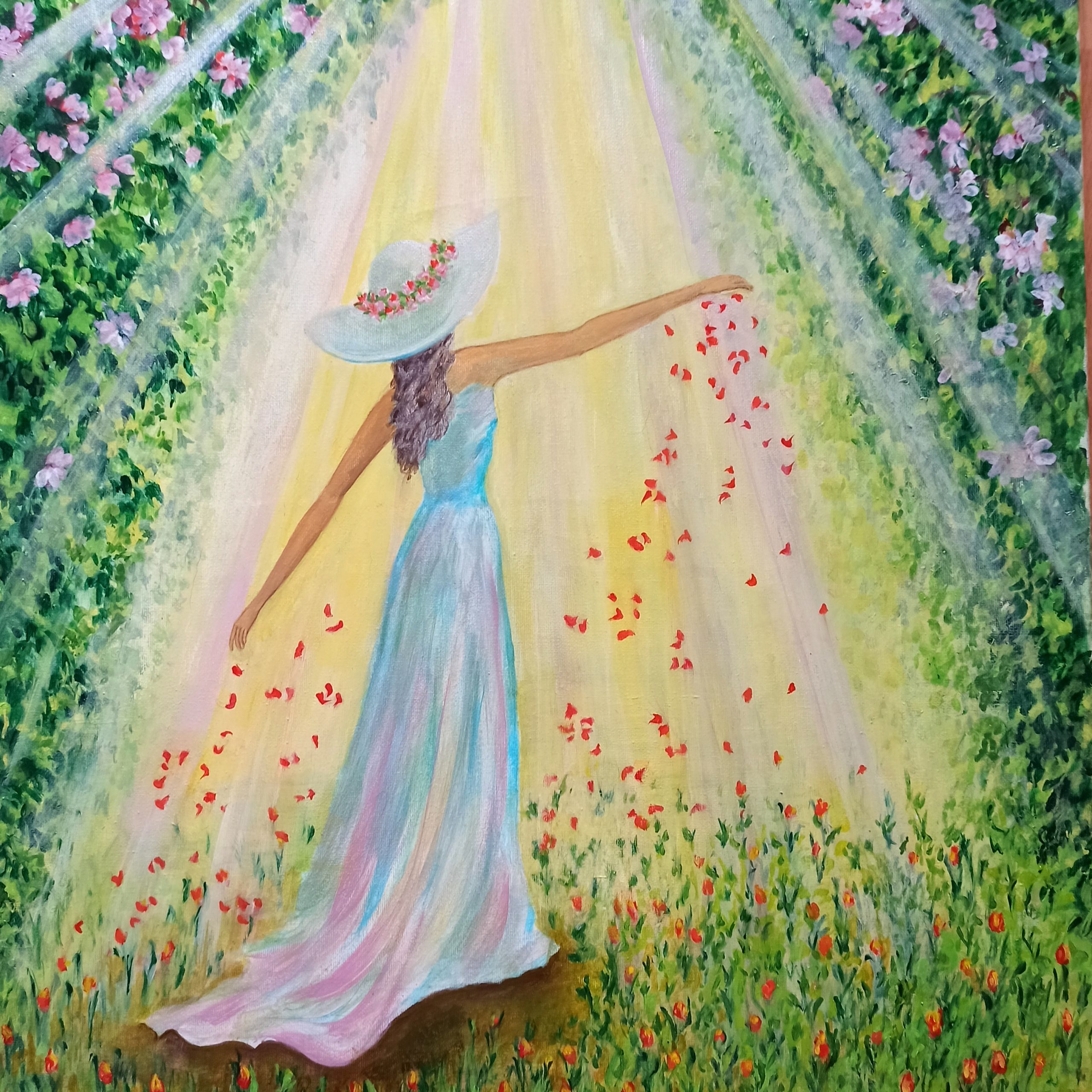 Пейзаж весны, символизирующий возрождение жизни после разрушительных испытаний, воплощение мира и гармонии между людьми и в природе. Яркое солнце, пробивающееся сквозь ветви деревьев — символ надежды и света будущего. Цветущие деревья и поля цветов — признаки обновления природы и победы жизни и мира над разрушением. Цветовая гамма: теплые тона (желтый, зеленый, голубой), яркие краски солнца и цветения — ассоциируются с жизнью, радостью и миром.