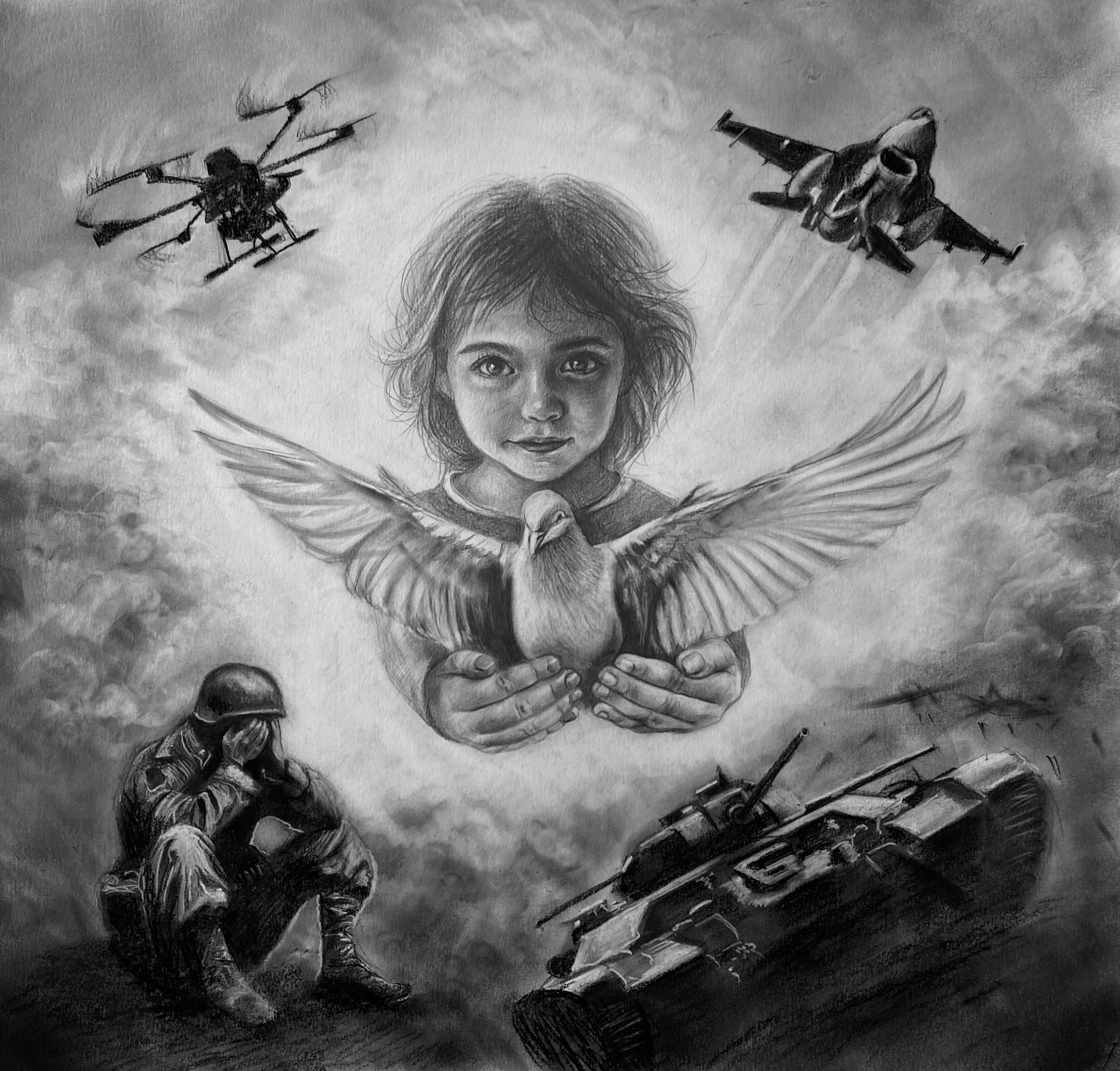 «Голос мира» В основе концепции картины лежит противопоставление разрушительной силы войны и хрупкой надежды на мир. В центре композиции — детские руки, нежно держащие голубя, символизирующего мир и надежду. Его распростёртые крылья словно защищают хрупкое спокойствие в центре хаоса. Вокруг разгорается антураж войны: в левом верхнем углу мерцает силуэт дрона, справа стремительно летит истребитель, снизу справа ползёт тяжёлый танк, оставляя за собой след разрушения. В левом нижнем углу сидит солдат, сгорбившись и закрыв лицо руками — его поза наполнена усталостью, отчаянием и болью. Черно-белая палитра и нюансы линий создают ощущение тревоги и напряжённого ожидания, но в центре композиции — свет надежды, исходящий от голубя. Эта работа задаёт важный вопрос: возможно ли сохранить чистоту души и свет мира даже среди самых тяжёлых испытаний?