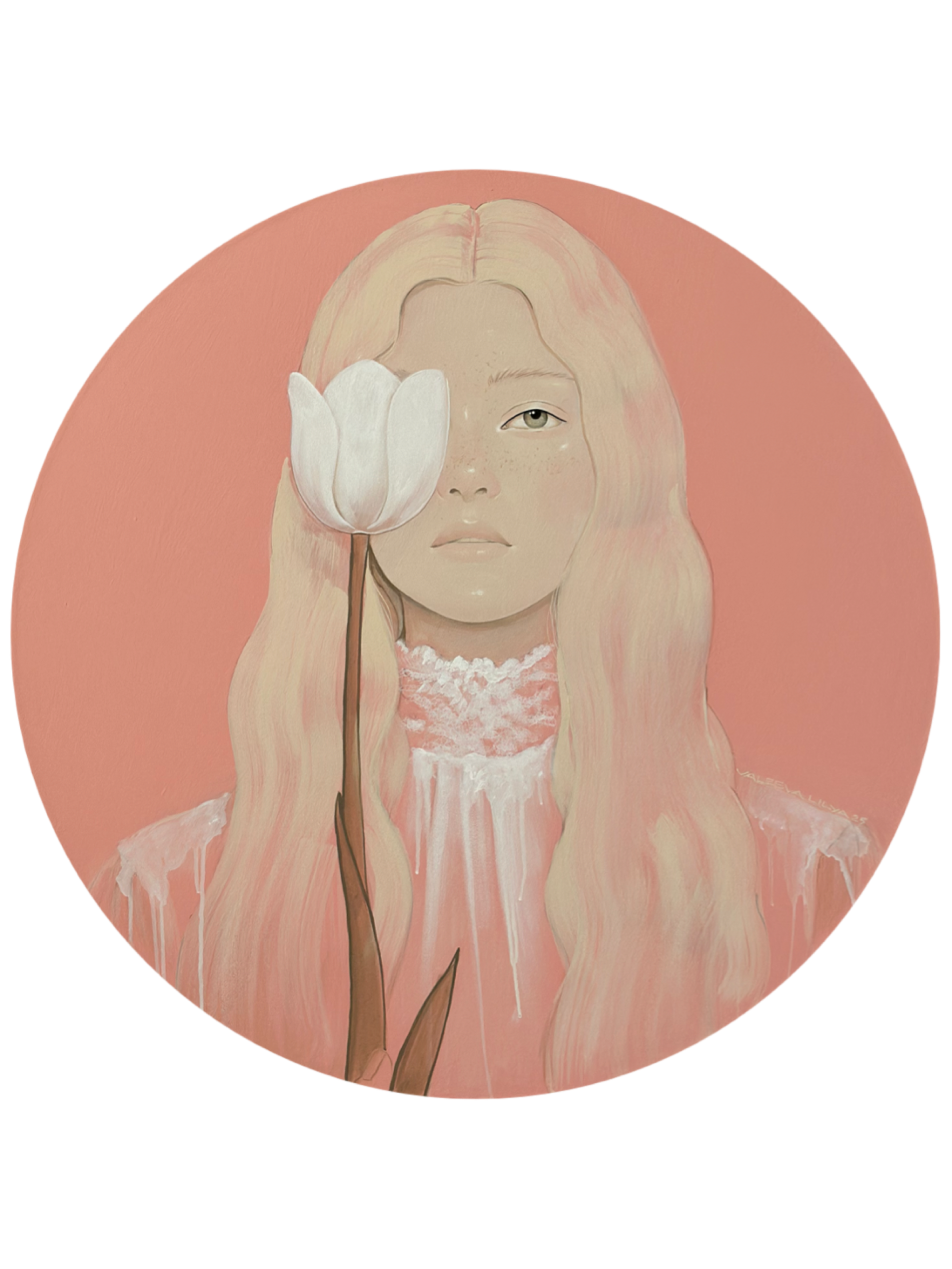 «ВЕСНА» 2025 Холст d-100см , акрил Образ девушки на работе , как символ мира , гармонии , спокойствия , красоты и обновления природы и всего человечества! Девушка в руке держит тюльпан- символ возрождение и обновления , а так же белый тюльпан считается символом искренности и чистоты намерений. Красота вокург тебя, есть отражение красоты внутри тебя. Красота не в лице, красота- это свет в сердце!