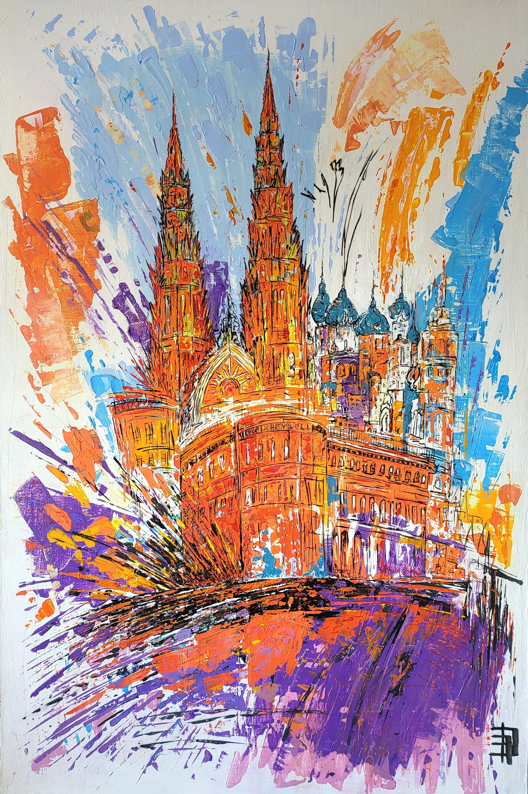 Картина «Победа — сияние триумфа» — символизирует торжество добра и победу над злом✨ Глубокие, яркие оттенки передают энергию и светлую силу, которая озаряет мирное время и гармонию. В каждый мазок я вложила надежду и уверенность в будущем. Общая композиция картины выбранна не случайно, она напоминает о важности единства и благополучия. За основу работы взят Римско-католический кафедральный Собор Непорочного зачатия Пресвятой Девы Марии с его неоготической композицией и шпилями уходящими в небо. Николо — Перервинский монастырь с куполами над Москвой рекой и Центральный дом учёных Российской академии наук. Я считаю, что не важна разница эпох, ценностей и верований — это все лишь разные отражения единой истины. В глубине души мы все связаны и едины, ведь за внешней оболочкой скрывается одно и то же — светлое стремление к миру, любви и гармонии.
