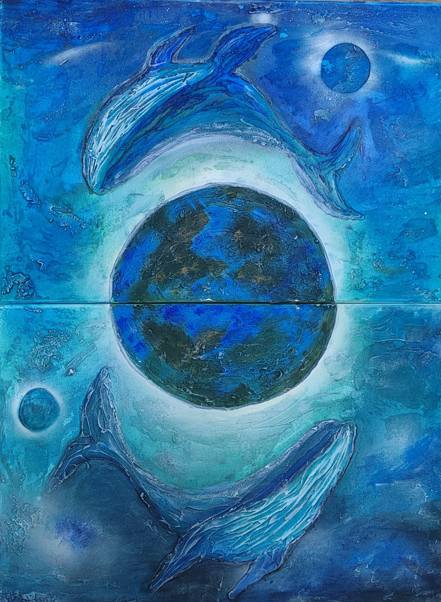 Сейчас непростое время для всей земли, период выхода негатива в виде войн и природных катаклизмов. Но мой Диптих «Трансформация» это картина будущего, где земля светится, а ее охраняют чудесные киты — представители Высших цивилизаций. Эта картина про мировую безопасность, спокойствие и умиротворение. «Мир стоит на 3 китах», в моем случае на 2-х что вносит некое ощущение устойчивости.