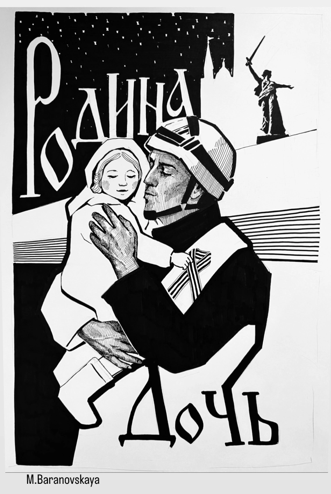 Плакат «Родина-Дочь» Из серии авторских плакатов, посвященных Дню Великой Победы. Родина-мать — известный визуальный образ, образ Русской земли, национальный символ единства. Это сила, власть и мудрость. Родина-мать защищает, призывает к борьбе за правду, к объединению против общего врага. Родина — дочь — второй образ. Дочь — та, кто нуждается в защите, за нее мы в ответе, за нее дадим отпор любому обидчику. Наша ответственность — воспитать ее правильно, дать ей лучшее будущее. Наша ответственность — ее оберегать. Что объединяет эти два образа? Конечно, любовь. Всегда — любовь.