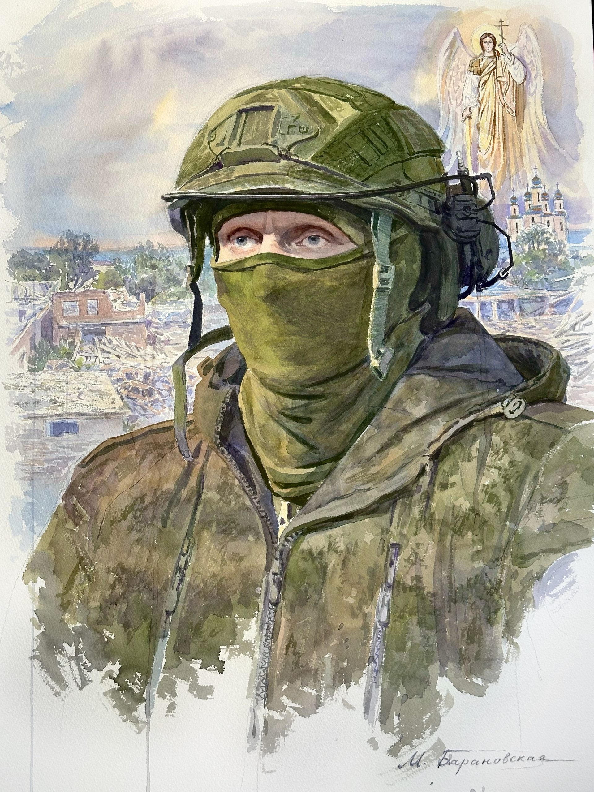 «Воскрешение» На портрете изображен Герой с позывным «Скиф». Сам портрет создавался более 4 часов с натуры (с перерывами), боец позировал с потрясающей выдержкой в полной экипировке и достаточно тяжелом военном шлеме. Боец изображен в суровой реальности, за спиной разрушенный город, но все же картина про свет и веру, которая нерушима. За плечом Героя мы видим уцелевший храм и как видение в небесах – Архангела Михаила – покровителя Земли Русской и сражающихся за справедливое дело. Он возникает как видение в золотых доспехах и с огненным мечом, освещая путь бойца. Мы живем в то время, когда особенно важно помнить о наших корнях, нашей истории, о наших Героях. Искусство, в данном случае, выступает мощным инструментом, который помогает нам сохранить эту память. Картина «Воскрешение» — символ памяти, соединяющий поколения, символ веры в светлое будущее.