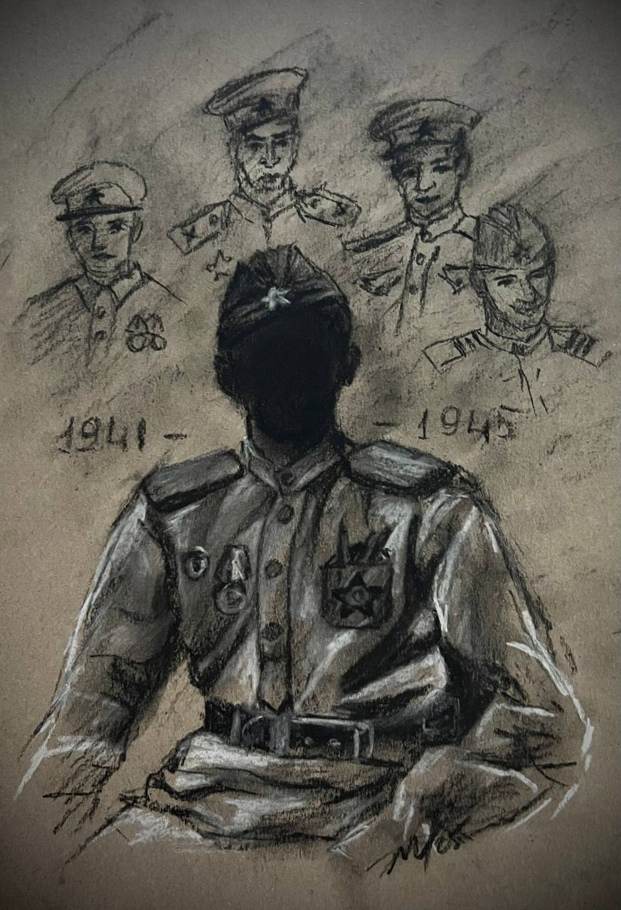 МОЯ ГОРДОСТЬ! Я никогда не видела своего деда. Его фото не сохранились. Поэтому я не смогла нарисовать его лицо. Его карман полон угля и карандашей — Он был художником и, находясь в действующих подразделениях, прямо на передовой, зарисовывал бойцов. Изготавливал вручную на дереве и линолеуме клише, которые печатались в газете. «Только за время зимних и весенних наступательных боев тов. Хоренко зарисовал и изготовил более 150 портретов наших казаков и до 50 гравюр-композиций. Ему же принадлежит инициатива составления альбома истории дивизии в фото-гравюрах. Чертежи и схемы, рисунки нового вооружения противника, которое быстро изготавливались Хоренко и подавались в газете, учили бойцов еще лучшему овладению вверенным оружием, помогали выполнению боевых задач, которые стояли перед дивизией». Награжден орденом «КРАСНАЯ ЗВЕЗДА».