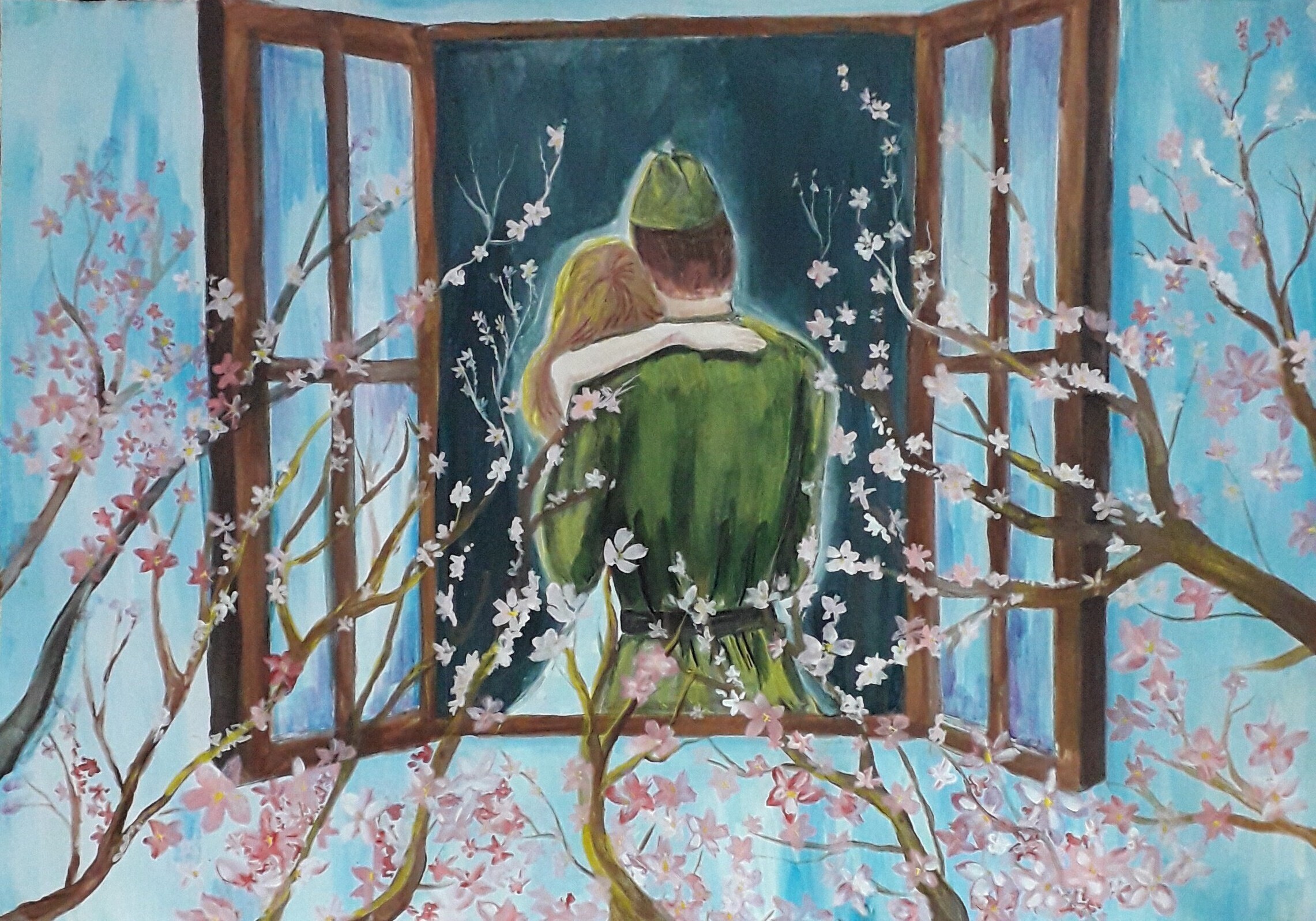 «Долгожданная встреча». На мою работу, которую я назвала «Долгожданная встреча» меня вдохновила картина Таутиева Владимира «Май. 1945 гoд». Я пыталась передать чувства, которые испытали герои после долгого и тяжкого расставания. Дом утопающий в яблоневом цвете, раскрытое окно, солнце, своими лучами освещающее солдата, вернувшегося с войны и девушку, все это говорит о радости встречи. Война позади, впереди счастливая жизнь!