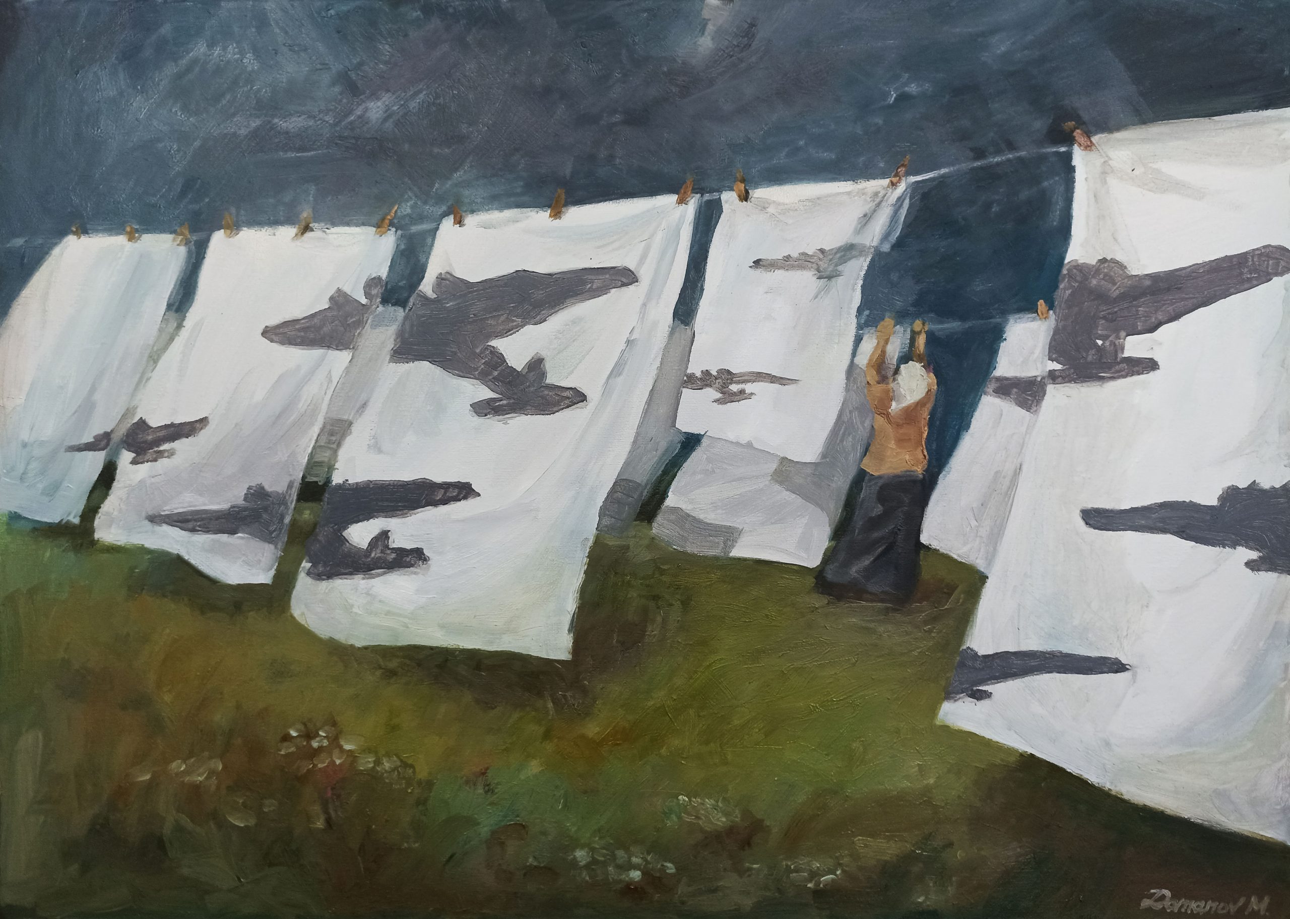 Картина «Ничто не забыто» через белые простыни, на которые проецируются хроники войны, олицетворяет вечную память о страшном военном времени.