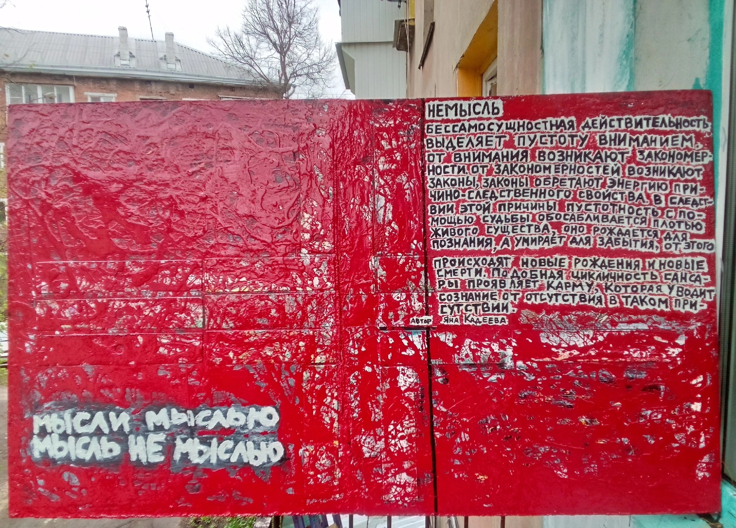 «Майтрейя в саду гнева» Визуальная составляющая, на мой взгляд, не требует описательной части, поэтому предоставляю хронологическую и историческую. Все мои работы, стихи и проза о единой неразрывной мудрости достижения иного берега существования. О ней бодхисаттвы знают больше, чем многие, так как они рождаются в миру и живут для познания фундаментальных вопросов в мироздании и передаче опыта, познанного стремящимся к просветлению. Бодхистаттвы мыслят немыслью – на перовом языке человечества. Эта картина об одной из немыслей, автором которой является Яна Кадеева, мой давний друг и близкая по духу. Красный фон в работе символизирует мирские мыли – желания и страсти, ведущие в могилу, уводящие от познания того, кем каждый был до своего рождения. Работа много раз переписывалась и прошла путь от картины до арт-объекта. Окончательный ее вариант представлен картиной. Сотни часов моя личность, художник Павел Семёнов, трудилась над её изменениями. Уже после её завершения я осознал, что интуитивное её создание отразило безграничную многогранность проявления Майтрейи в миру. Фундаментально менялась не только картина до исходного варианта, но и моя личность в процессе её создания. Скажу так: личность и была проявлением Майтрейи, и она создала эту картину, так как я в процессе её создания практиковал созерцание за происходящим. Основополагающая идея в том, что каждому необходимо стремиться к просветлению. Мысль в том, что не стоит бояться смерти, победа будет за нами. Вдохновило на создание картины общение с близкими по духу, единая неразрывная мудрость достижения иного берега существования. Побудило желание донести для каждого: раз уж родился, пробудись, пожалуйста, из омрачающих иллюзий, у тебя всё для этого есть.