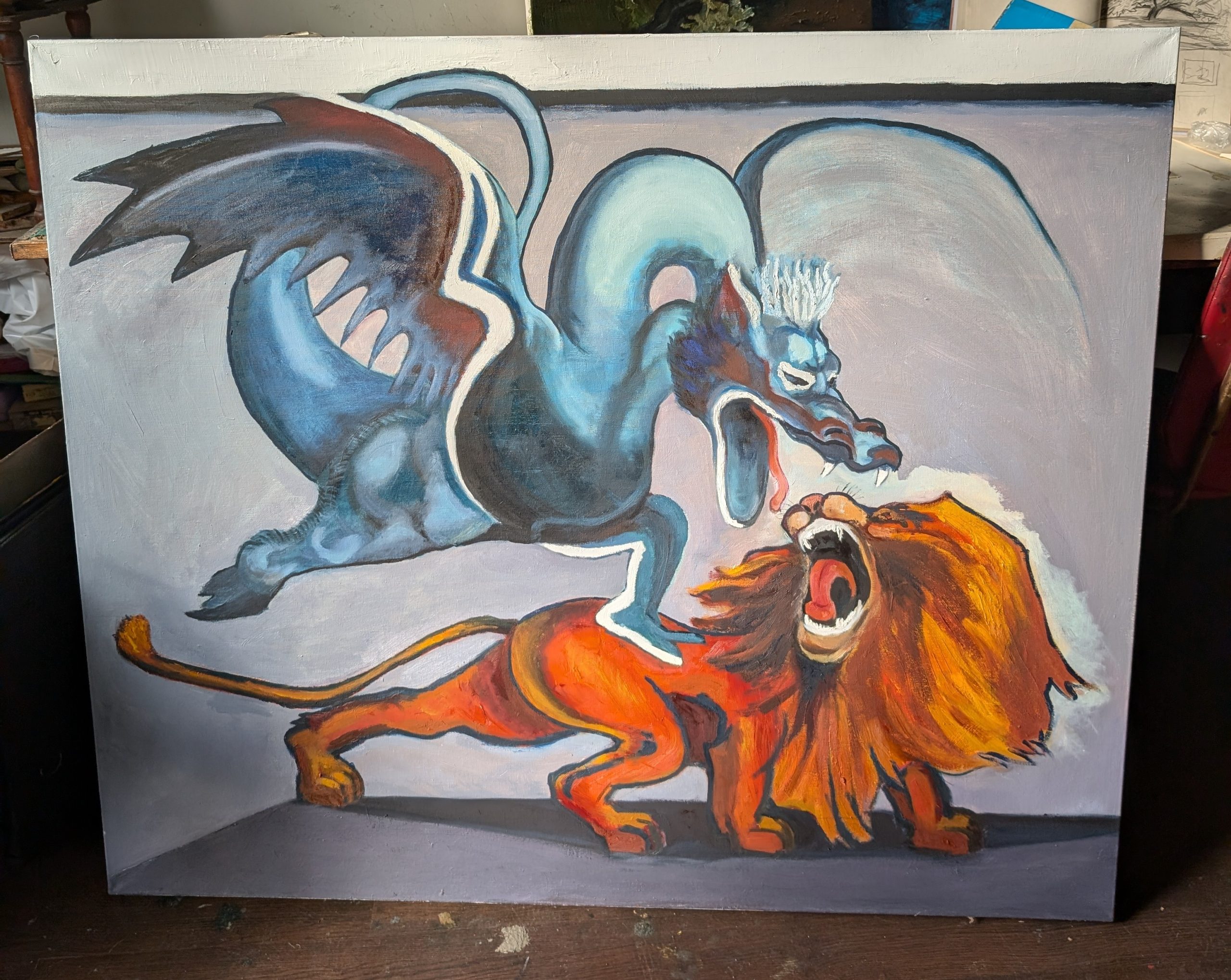 На картине изображена сцена битвы между двумя мифическими существами: драконом и львом. Темные оттенки и агрессивная поза льва подчёркивают его мощь и угрозу. Лев, напротив, олицетворяет свет и порядок. Его оранжевые и коричневые тона излучают тепло и силу, а широко раскрытая пасть демонстрирует его решимость и готовность защищать добро. Фон картины, выполненный в нейтральных серых тонах, создает контраст и подчеркивает драматизм сцены. Эта битва символизирует вечную борьбу между добром и злом, где каждый из противников стремится одержать верх, но исход остается неизвестным, оставляя зрителя в напряжении и размышлениях. Автор картины, изображающей эпическую битву между драконом и львом, надеется, что эта схватка закончится миром. Несмотря на кажущуюся неизбежность конфликта, художник верит в возможность примирения и гармонии между противоборствующими силами. Он стремится показать, что даже в самых напряженных ситуациях можно найти путь к взаимопониманию и сотрудничеству. Автор надеется, что зрители, глядя на картину, смогут увидеть не только борьбу, но и потенциал для мира, который может возникнуть из самых неожиданных источников.