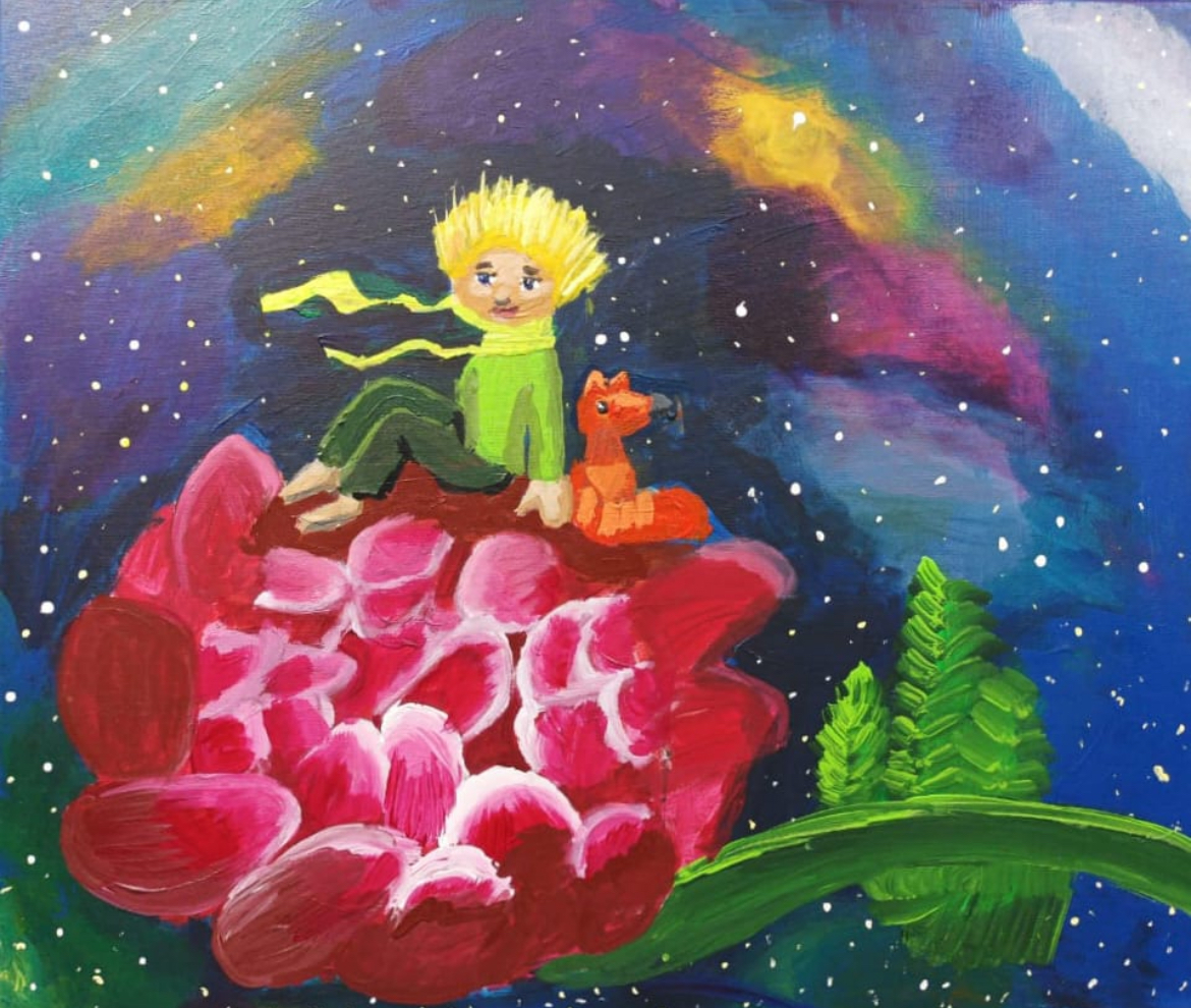 Петухов Роман, 9 лет. «Нет в мире совершенства». Антуан де Сент Экзюпери в период Второй Мировой войны, во время нахождения в Нью- Йорке в военном госпитале пишет свое известное произведение-сказку «Маленький принц».Вдохновением к написанию данного произведения служили мысли автора о тяжелых временах, переживаниях о войне и нескором мире . Вдохновившись произведением «Маленький принц» и переживаниями автора , я написал картину «Нет в мире совершенства»и попытался передать в ней глубокий смысл …..военный период в любое время, в любые времена тяжёлое испытание для каждого человека и громкая душевная боль, не считая уже физической. Одни борятся за право выжить и существовать имея в руках примитивное оружие другие имея совершенные знания умения и навыки и технологии идут им в противовес , совершенное сталкивается с несовершенным … ради чего .. какой цели… вечные терзания души человека… а как терзаются солдаты ? Зачем складывают свою жизнь ….Также как и принц в поисках ответов на вопросы: Имеет ли смысл причинять боль ради любви? Имеет ли смысл причинять боль ради счастья? Сам автор произведения долго не мог решиться на твердый ответ на этот вопрос, однако отметил — если за такой огромной ценой стоит жизнь миллионов людей на планете и речь идет даже о будущих поколениях, то конечно имеет. Ведь мы все едины! Мир будущего создается нашими руками. И потому название картины «Нет в мире совершенства» обретает позитивный смысл, как право на волю и цель к бесконечному стремлению к гармонии.