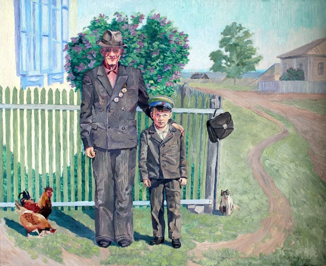 Мои 3 деда пропали безвести в годы ВОВ.Рос без отца.А через дорогу напротив жил сосед-фронтовик дядя Ваня.Он частично и заменил мне отца.Мы жили дружно и вначале я,хотел назвать эту работу «Друзья 70-х».В этой работе я,отразил преемственность поколений.Сосед -фронтовик воевавший за безоблачное небо и я,ещё октябренок стоящий рядом после занятий в школе.Цветущая сирень как в мае 1945г.На голове у меня надета не по размеру солдатская фуражка подаренная фронтовиком и я,гордился ей и своим соседом.