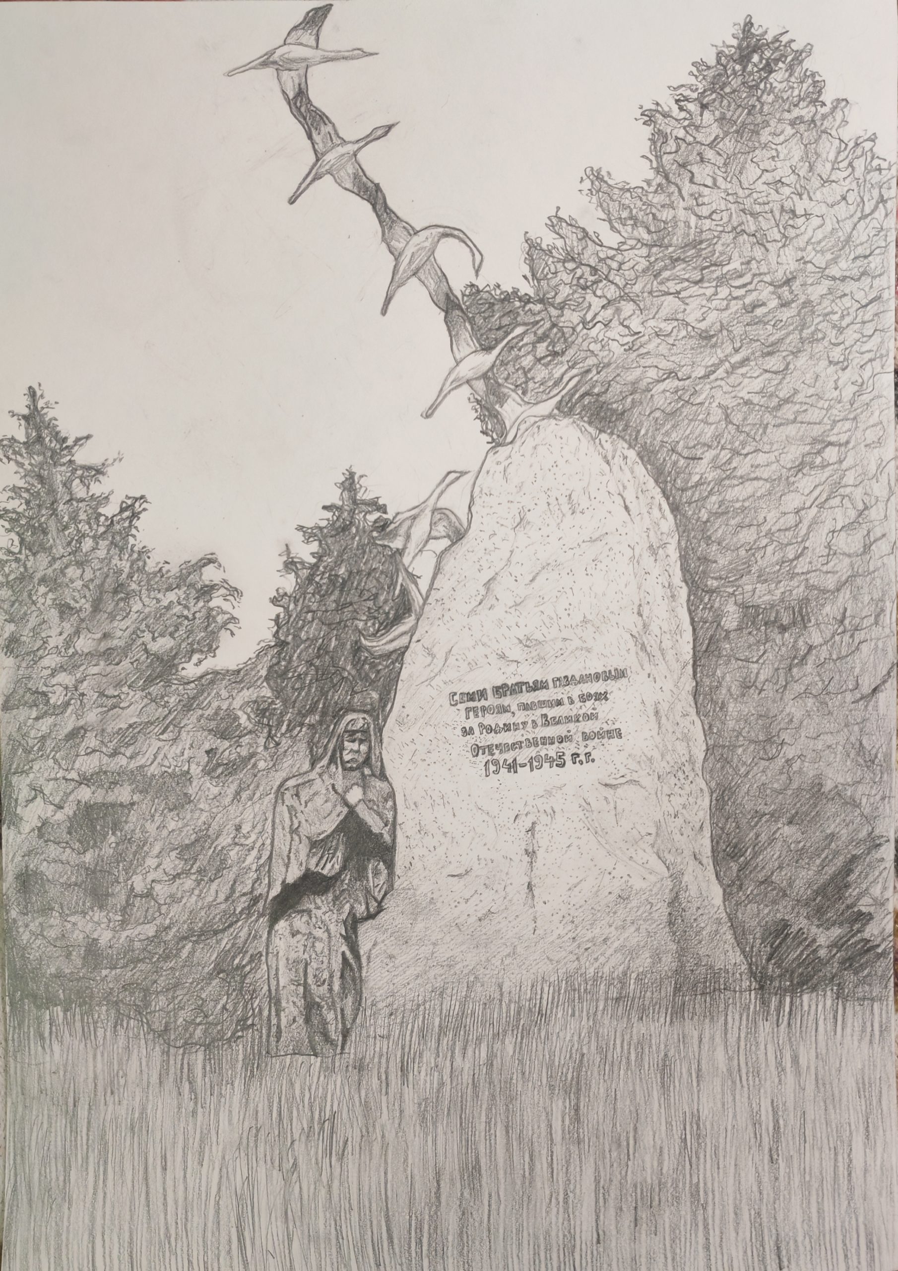«Памятник 7 братьям Газдановым». Графическая работа карандашом, изображающая памятник, посвященный героям Великой Отечественной войны. В центре композиции — большой камень с надписью, вокруг которого расположены деревья и трава, создавая атмосферу спокойствия и памяти. птицы символизируют свободу и вечную память. Скорбящая женщина выражает уважения и почтение к павшим героям. работа передает глубокое чувство благодарности, скорби и уважения к подвигам прошлого.