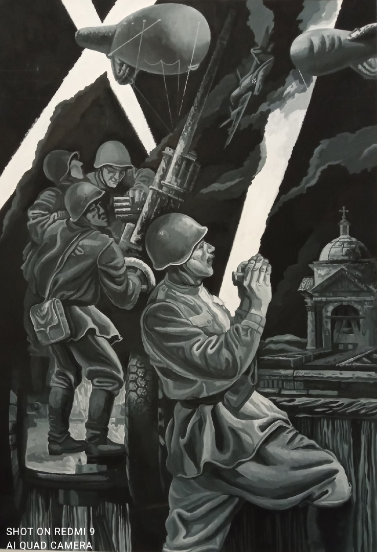 «Зенитчики» — Центральная часть триптиха «Блокадному Ленинграду посвящается». Бумага, темпера, 70х50 см