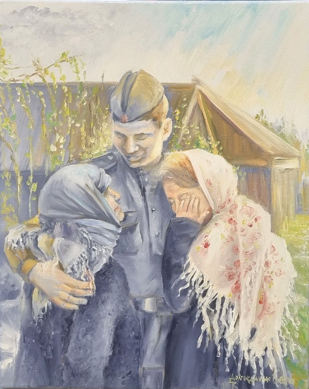 Долгожданная встреча, долгожданная Весна. На картине запечатлен момент встречи родных: мамы, солдата и его жены. Радость долгожданного возвращения проявляется не только на лицах героев, но и в пробуждении природы. Оживают, цветы, деревья, травы. Лица и все вокруг проявляются цветом и светом, сбрасывая горечь печали, тревог, волнений и страха, переходя из монохромного, траурного состояния в мир, дарующий надежду и счастье. Долгожданная Весна