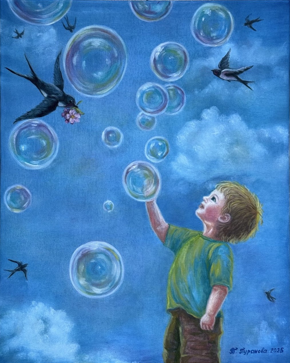 На картине маленький мальчуган с восторгом смотрит на воздушные шары. Его взгляд полон удивления и радости, он думает о чем-то недостижимом, но таком близком. Пузыри, переливающиеся всеми цветами радуги, символизируют мечты, надежды и детские фантазии, которые, как и пузыри, могут быть хрупкими и недолговечными, но в то же время прекрасными и вдохновляющими. Летающие в небе птицы символизируют стремление к независимости и полету мысли. Яркая цветовая гамма картины создает атмосферу радости и беззаботности, подчеркивая детскую непосредственность и чистоту восприятия мира. Смысл картины заключается в том, что детство — это время, когда мечты кажутся реальными, а мир полон чудес. Это время, когда можно позволить себе мечтать и верить в невозможное. Картина напоминает о важности сохранять в себе эту детскую способность удивляться и радоваться простым вещам, даже тогда, когда мы становимся взрослыми.