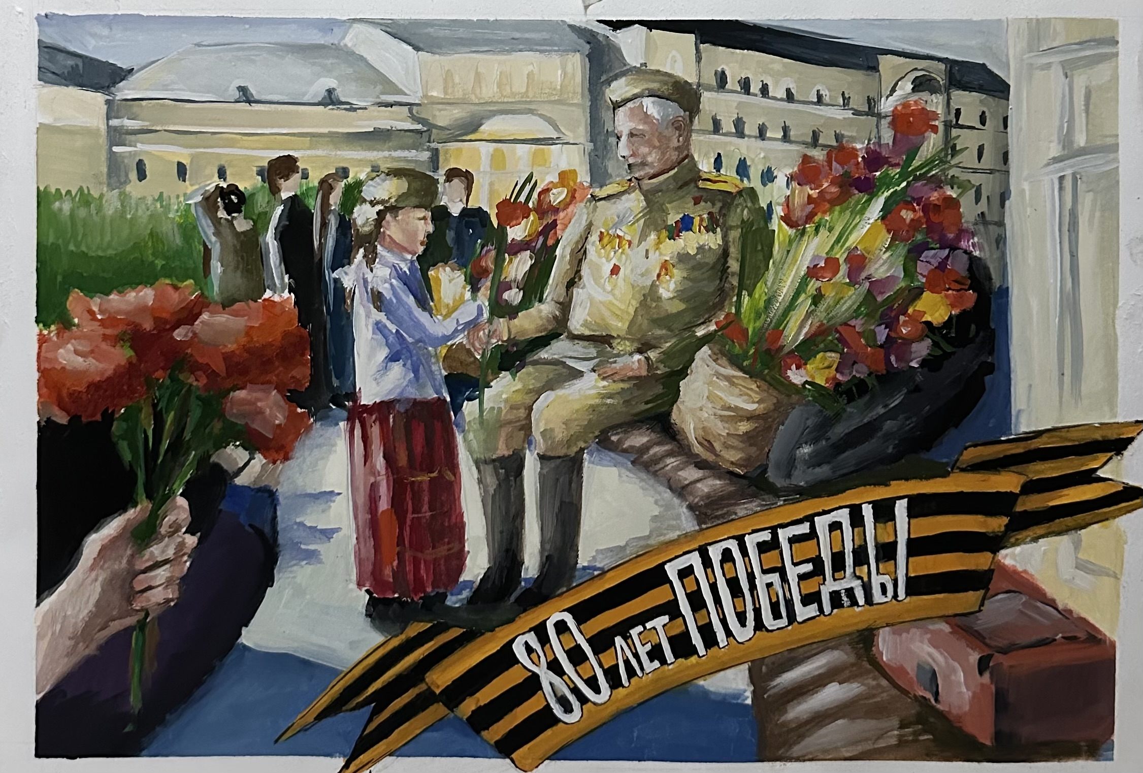 «80 лет Победы: Связь Поколений» Эта яркая и трогательная картина, выполненная гуашью посвящена празднованию Дня Победы. В центре композиции изображены две фигуры, символизирующие связь поколений: 1. Пожилой ветеран: Седоволосый мужчина в военной форме, украшенной многочисленными медалями и орденами, сидит на скамейке или парапете. Его лицо выражает мудрость и спокойствие. 2. Молодая девочка: Одетая в традиционный русский наряд — белую рубашку с вышивкой, красную длинную юбку и пилотку на голове — протягивает ветерану цветок. Их взаимодействие — рукопожатие и обмен цветами — является центральным элементом, подчеркивающим преемственность памяти и благодарности молодого поколения за подвиг ветеранов. Работа наполнена теплыми, насыщенными цветами и излучает атмосферу уважения, благодарности, памяти и мирного праздника. Она очень эмоционально передает идею о неразрывной связи времен и поколений, объединенных общей историей и гордостью за Великую Победу.