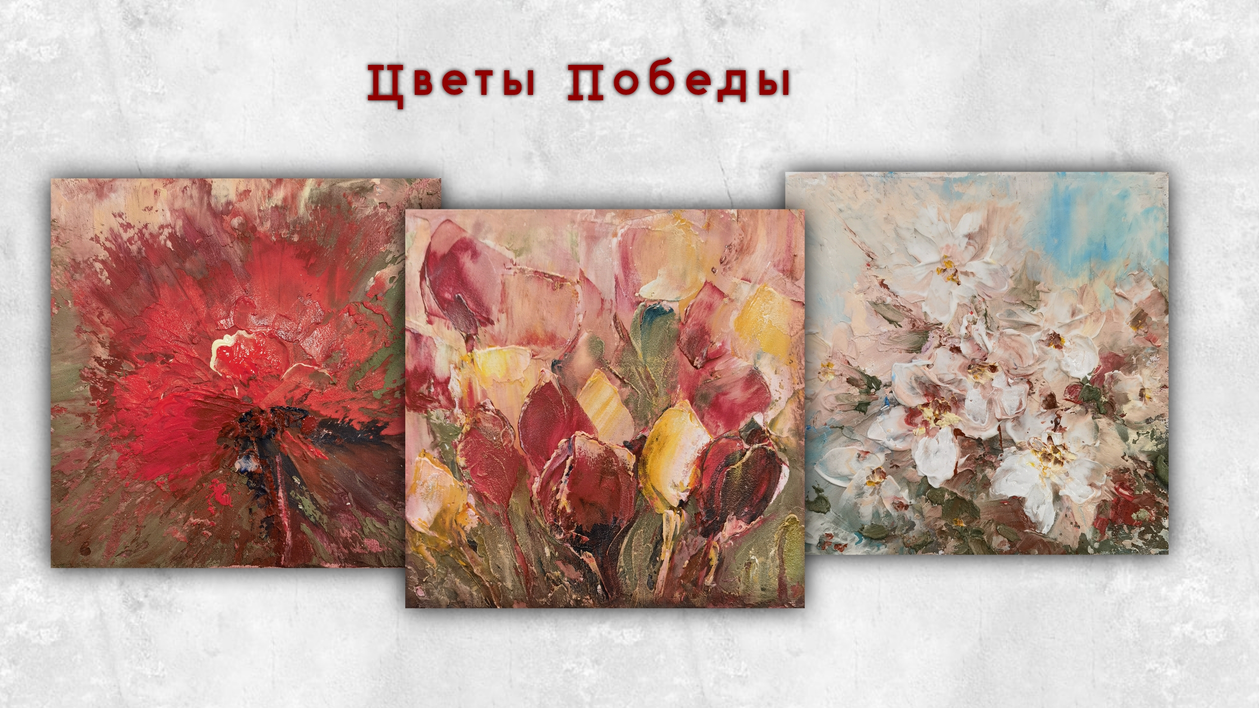 Серия «Цветы Победы» — это размышление о памяти и надежде, о трагедии войны и торжестве жизни. В этих работах переплетаются символы мужества и хрупкости, скорби и радости. Красный, цвет пролитой крови, соседствует с нежными оттенками весеннего цветения, напоминая о цене, заплаченной за мир, и о том, что жизнь всегда побеждает смерть. Серия «Цветы Победы» выполнена в пастозной технике, что позволяет максимально выразить энергию и эмоции, заложенные в каждой работе. Объемные мазки, словно живые, дышат историей и напоминают о событиях тех далеких лет. В этой серии цветы — это не просто красивые растения, а символы памяти, благодарности и надежды на светлое будущее. 1.Этот красный цветок – словно пульсирующее сердце, наполненное памятью о тех, кто отдал свои жизни за Победу. Красные оттенки, словно кровь, пролитая на полях сражений, напоминают о страшной цене, заплаченной за мир. Но даже в этом трагизме есть сила жизни, пробивающаяся сквозь тьму. Пусть этот цветок станет символом нашей вечной памяти и благодарности. 2.Эти цветы – словно воплощение памяти о Великой Победе. Зеленый, цвет солдатской шинели, переплетается с ванильным – цветом надежды и тепла, рождая нежный, но сильный образ. Алые мазки, словно вспышки праздничного салюта, напоминают о радости освобождения. Картина – это не просто букет, а целая история о мужестве, стойкости и победе над смертью. 3.На этой картине – благоухающий сад под мирным небом. И хочется верить, что там, где когда-то гремели взрывы и лилась кровь, сегодня растут прекрасные цветы. Пастозные мазки, светлые тона создают ощущение нежности, спокойствия, веры в то, что ужасы войны никогда не повторятся. Да будет так всегда!