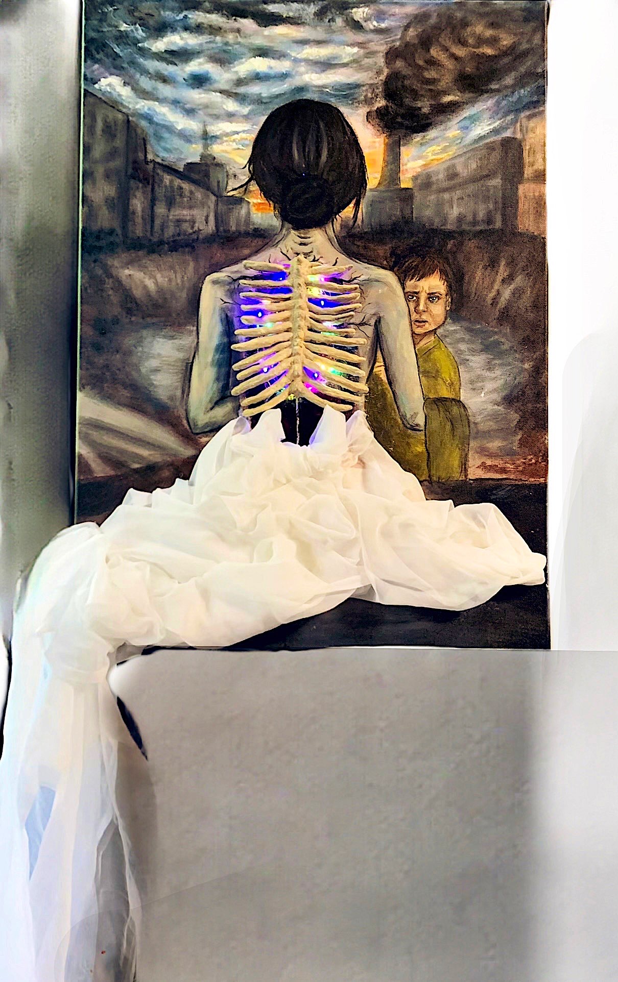 Исторический контекст картины. На эту картину меня, как жительницу Санкт-Петербурга, вдохновила сильная история нашего города. В особенности, в блокадном Ленинграде существовали женщины, ставшие символом материнской любви и невероятной стойкости — Кормилицы. Одна из таких кормилиц, Анна Никифоровна Тихомирова. Она была известна тем, что в январе 42 года, она потеряла двухнедельную дочь, а после осталась при роддоме и следующие целых 2 года, несмотря на холод, голод, бесконечные авиаудары своим грудным молоком выхаживала новорождённых детей, оставшихся без матерей, погибших от голода или болезней. Она собирала малюток, вскармливав их и оставляла в своих объятиях надежду на жизнь. Кормилицы, подобные ей, стали живыми олицетворениями женственности, стойкости духа, заботы, силы и ,конечно, надежды. Композиция. Центральной фигурой картины выступает женщина, Кормилица, олицетворяющая всех кормилиц Блокадного Ленинграда, с видимой грудной клеткой, что не только подчеркивает физическое истощение, но и символизирует глубокую привязанность к детям, мужество и Материнское сердце, какое есть сейчас не у всех. Эта фигура обращена спиной к зрителю, что создает дистанцию и одновременно вовлекает в её страдания. Белый, не запятнанный сарафан, символизирует душевную чистоту, несмотря на страшные обстоятельства. На заднем плане мы наблюдаем разрушенные здания с дымящимися трубами, что вызывает ассоциации с хаосом и страданиями. Мальчик, изображенный рядом, символизирует всех детей, все те тоненькие ниточки жизни, которые спасали Женщины. Так же, розовощекий малыш символизирует надежду, новые жизни и будущее, которое вопреки всем испытаниям и слишком рано повзрослевшим глазам, продолжают существовать. Эмоциональное воздействие. Эмоциональная сила картины заключается в её способности пробудить глубокие чувства сочувствия и уважения к женщинам, пережившим невыносимые страдания, но сохранившей в себе любовь, человечность и огонек внутри. Каждый элемент композиции, от деталей фона до световых акцентов на фигуре кормилицы, несет в себе мощный контраст между физическим, моральным истощениями и внутренним светом, между смертью и самой жизнью. Для меня, эта работа стала историческим высказыванием, призывающее сохранить память о тех, кто выстоял в годы блокады. Эта история стоит на страже исторической памяти, напоминая нам о жертвах и героизме во времена страшного испытания- Великой Отечественной Войны.