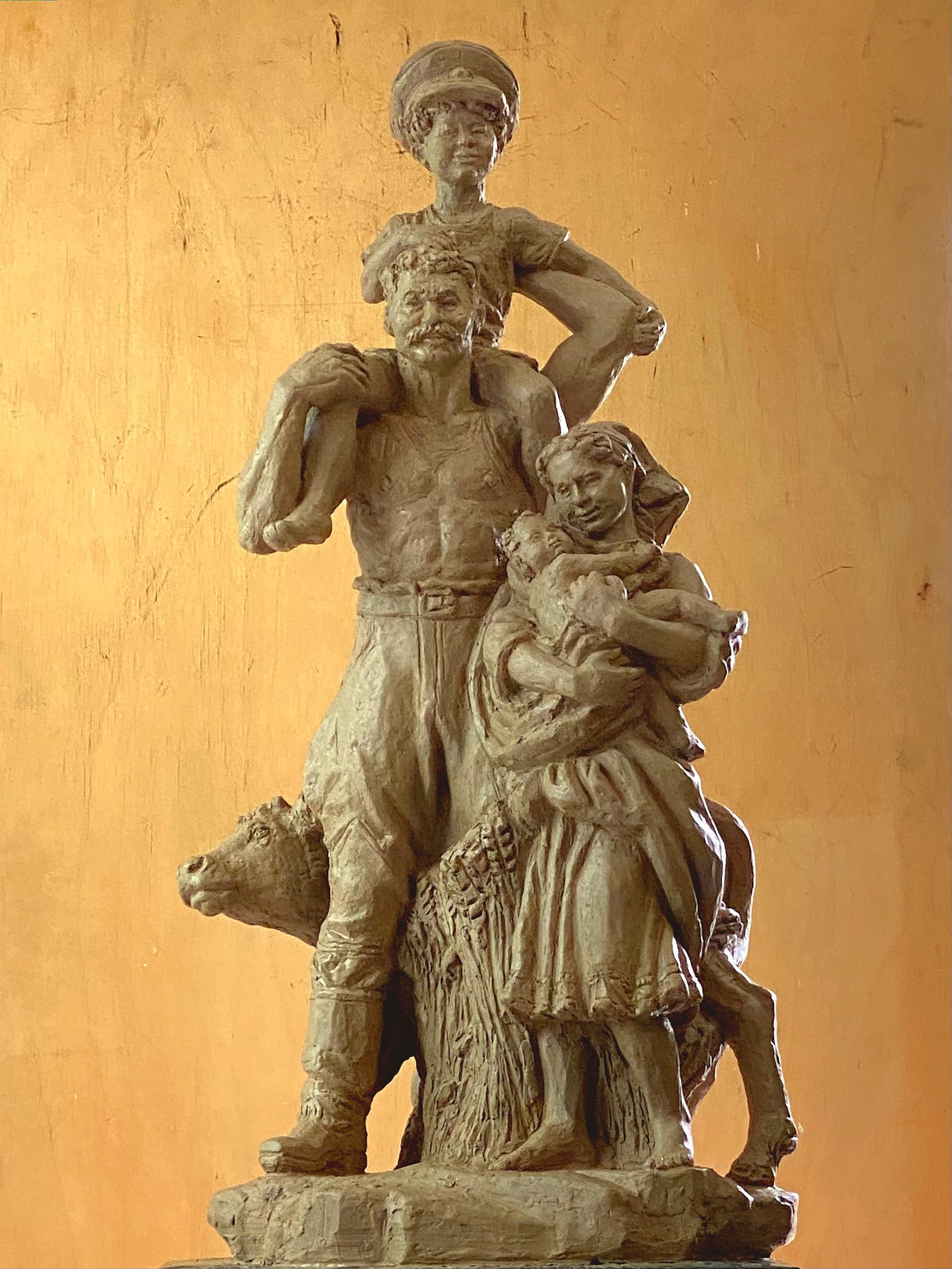 Скульптура называется : « Мирный 1946, первый год без войны » Советский офицер, воин-победитель вернулся с фронта в свою деревню к жене и маленькому сыну и началась мирная жизнь в трудах, наполненная радостями жизни и заботой о хлебе насущном, в надежде на светлое будущее без войны! Скульптура передает атмосферу счастья и надежды, подчеркивая важность семьи и дома для каждого человека, особенно после трудных испытаний и разлуки. Она напоминает о том, что, несмотря на все трудности, возвращение домой к любимым людям является величайшей наградой и источником силы.